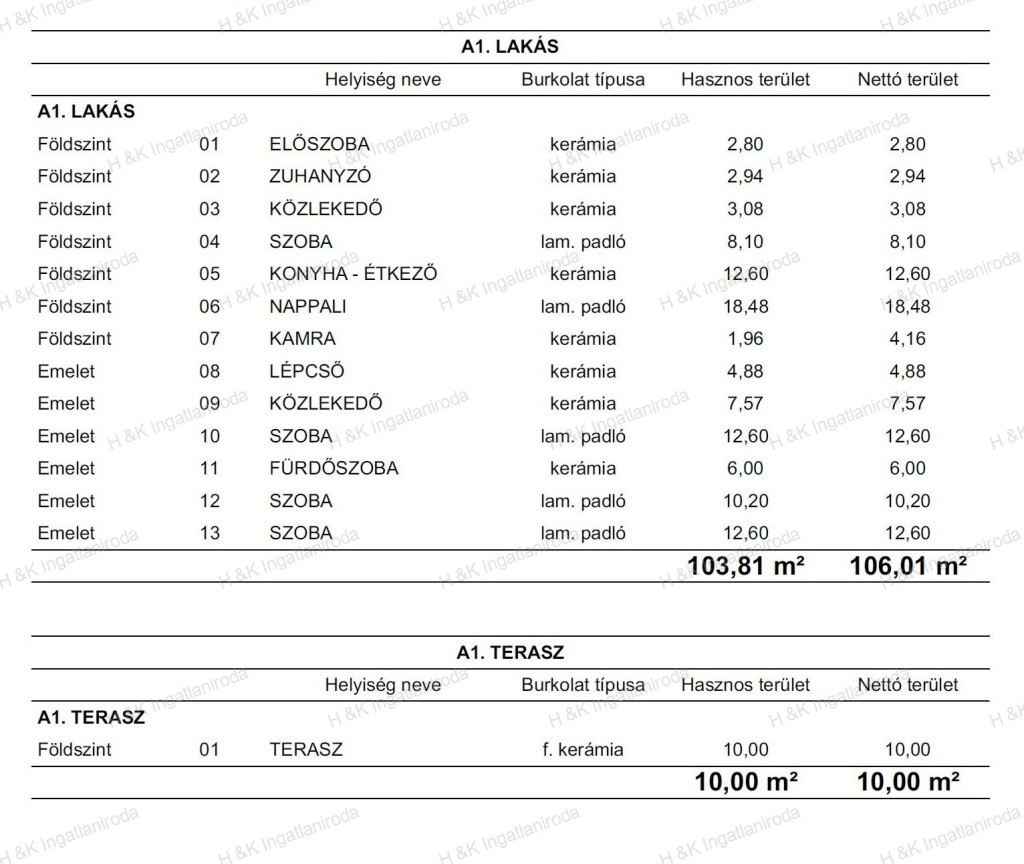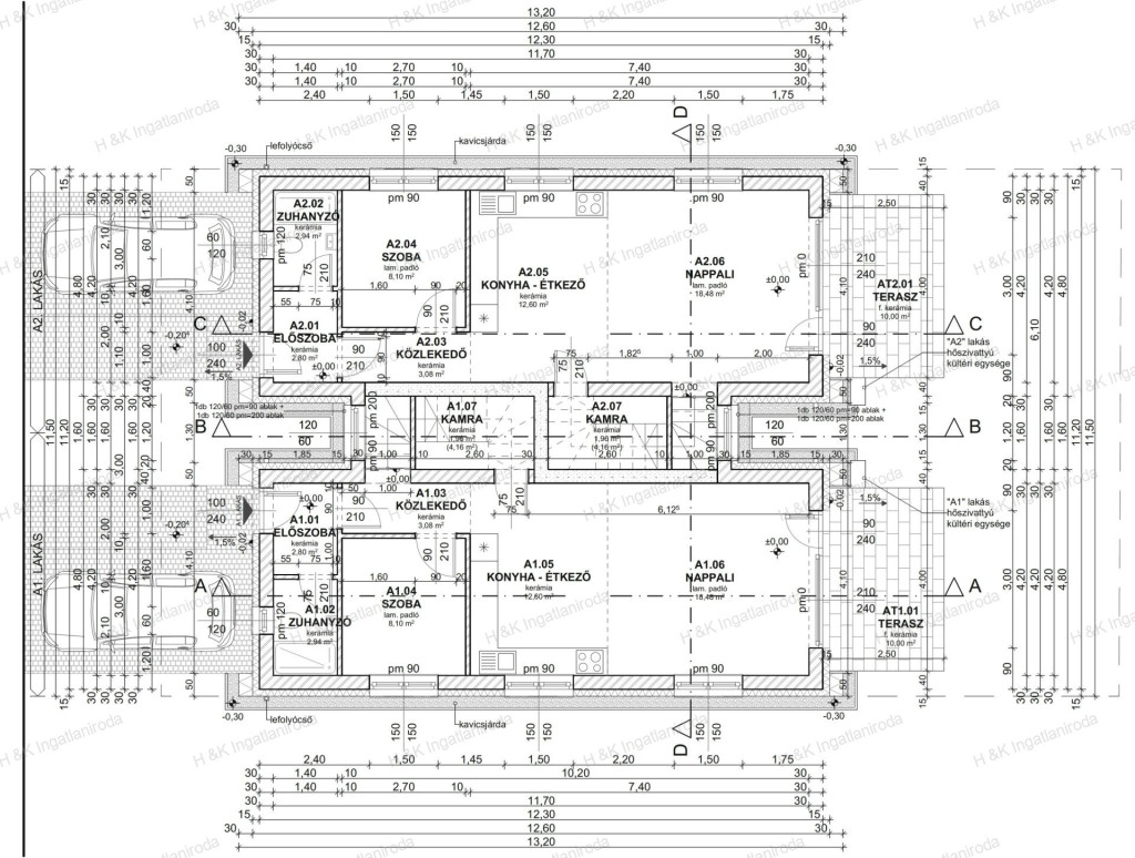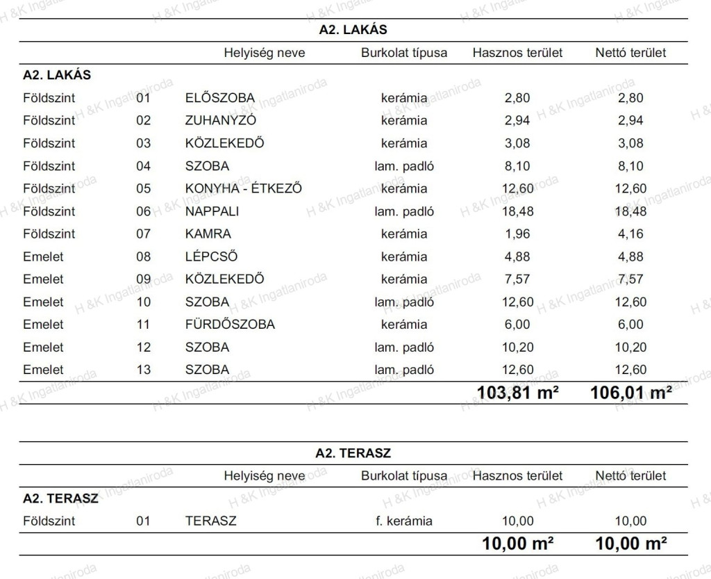 Az 569 nm-es telekre épülő ház két lakása belső elrendezésében megegyezik: amerikai-konyhás nappali + 4 szobás, dupla-komfortos, zárt udvari gépkocsi beállóval és 285 nm-es kizárólagos telekrészekkel rendelkezik. A lakóterületük 106 nm + 10 nm terasz.