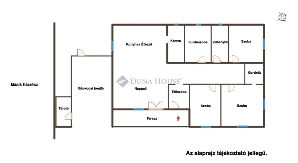 Belső elrendezés: előtérből, amerikai konyhás nappaliból, három szobából, fürdőszobából, háztartási helyiségből és egy gardrób szobából áll.. A hozzá tartozó terasz 21,44.m². Az ingatlanhoz ezen felül tartozik még egy fedett gépkocsibeálló és egy kerti tároló is.
