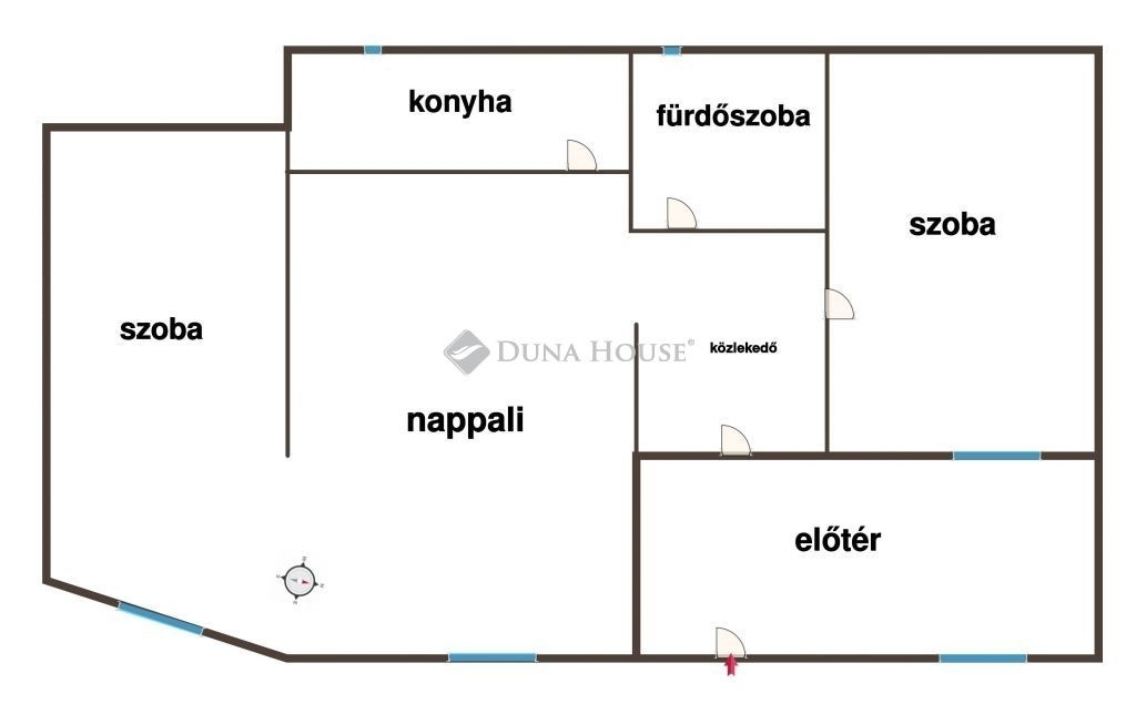 Nappali, 2 szoba, konyha, közlekedő, fürdőszoba, nagy méretű előszoba.