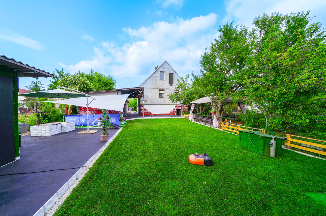 Két különálló épület egy 652 m²-es telken, kiváló elhelyezkedéssel (reptér, bevásárlás, tömegközlekedés a közelben). A főépület 6 szobás, tetőtere teljesen beépített, 2 fürdőszobás, nagy pincével. A kert rendezett: kerti WC és mosdó, grillterasz, fedett pavilon, medencehely-kialakítás, két fészer. Az ingatlan szigetelt, a fűtés és a használati melegvíz rendszere korszerű, energiahatékony.