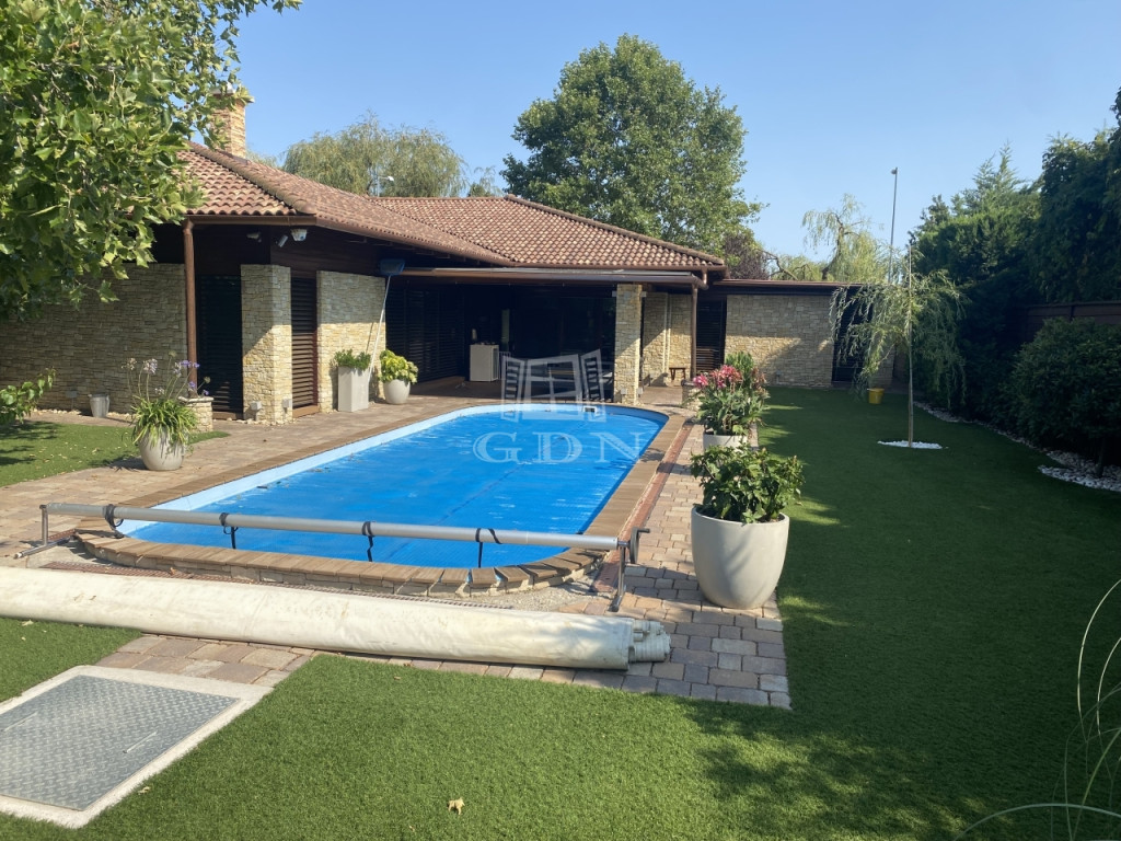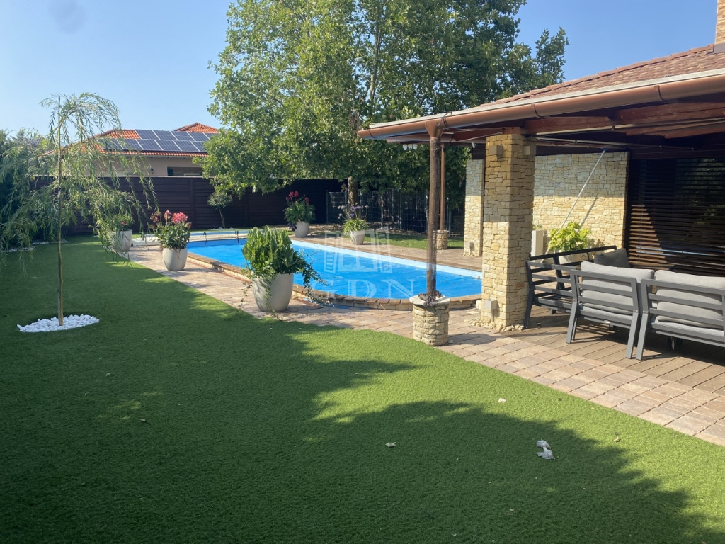 A parkosított kert igazi privát oázis: medence, gyönyörűen karbantartott műfű, rendezett környezet várja az új tulajdonost.