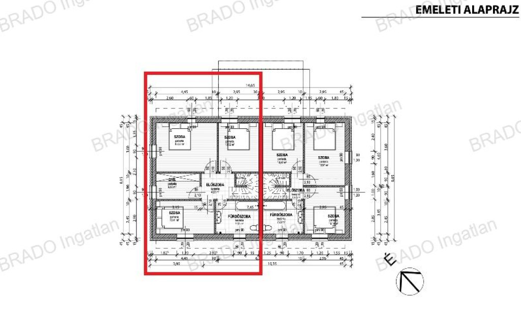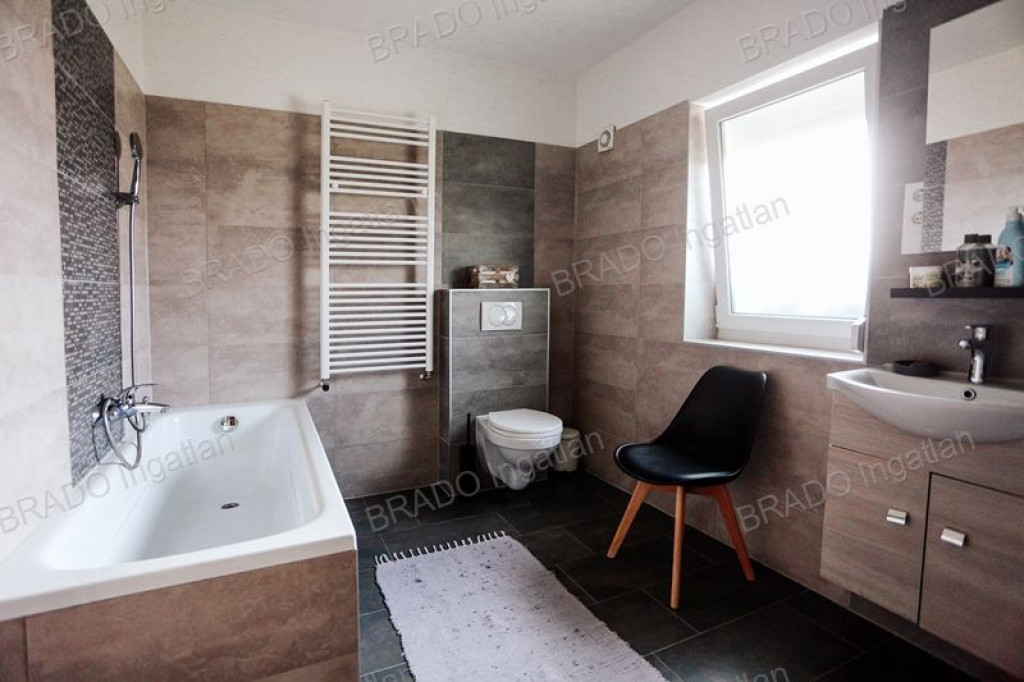Az emeleti helyiségek: előtér, négy db hálószoba, nagy, kádas fürdőszoba WC-vel.