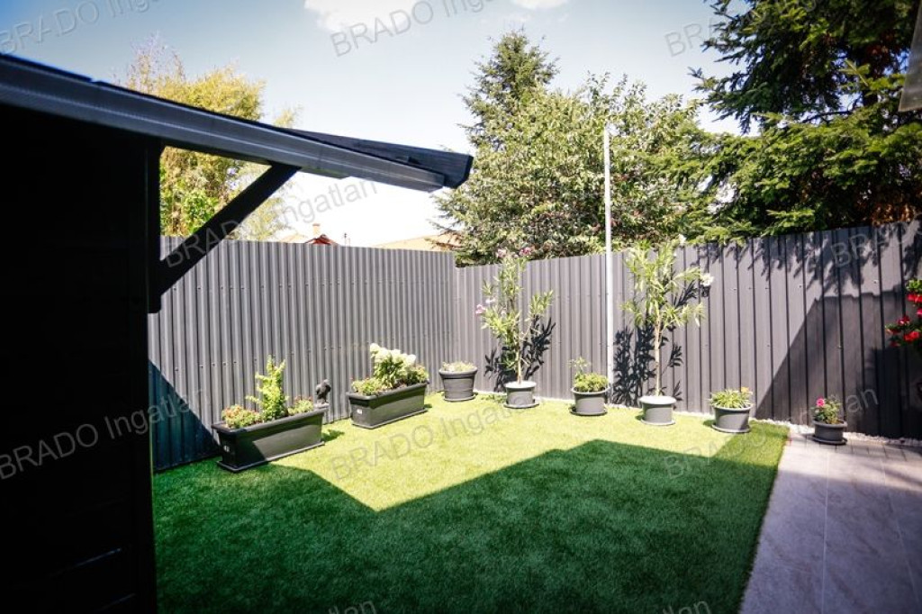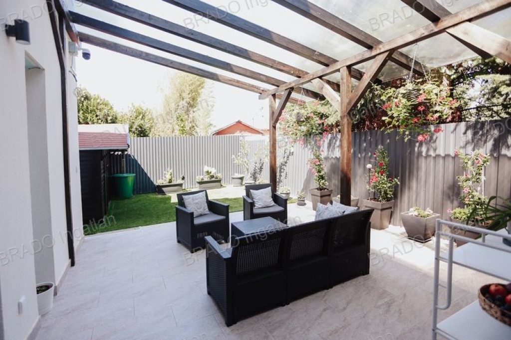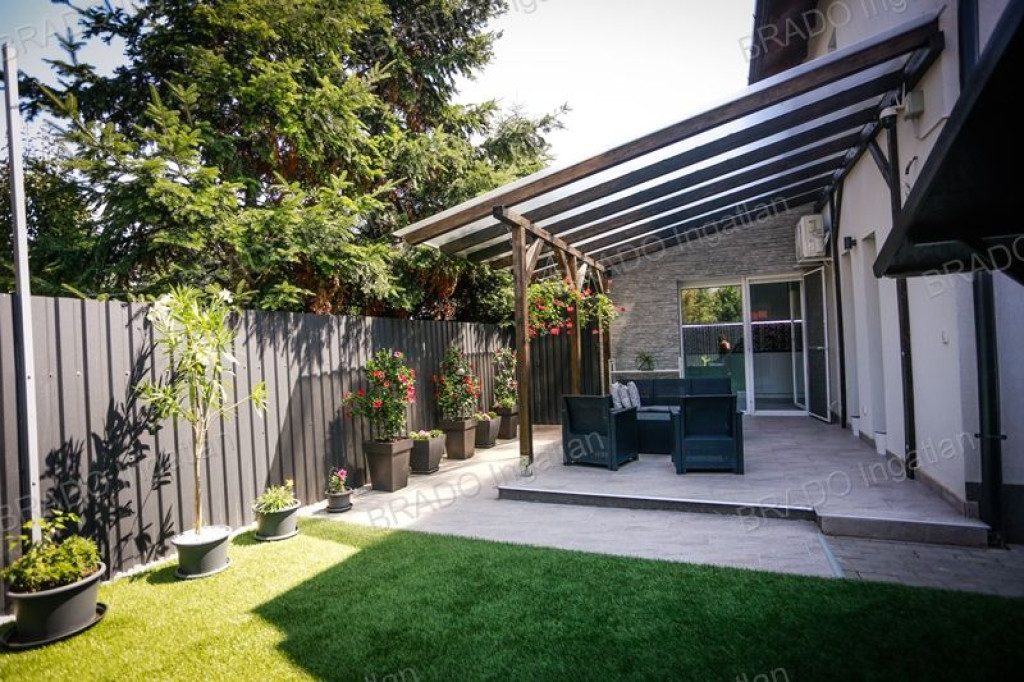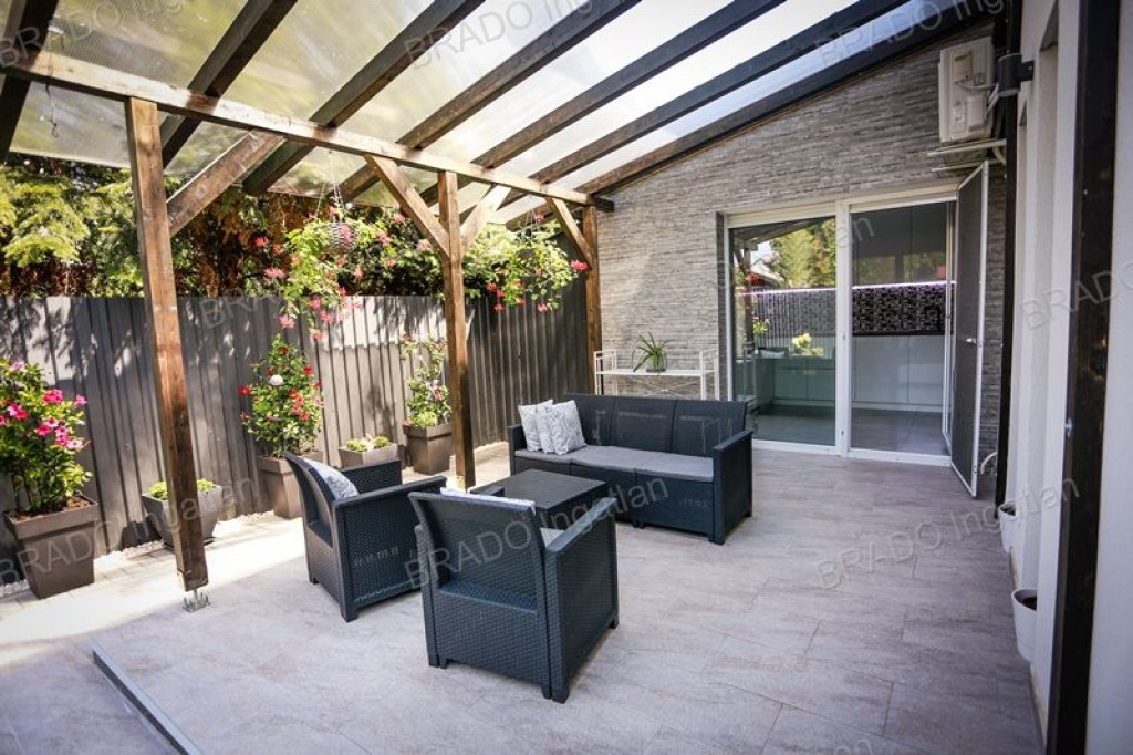 A nappaliból juthatunk ki egy tökéletesen megálmodott fedett teraszra, mely mellett létesült egy kis tároló a kültéri eszközöknek. A terasz mellett kőburkolatú autóbeálló található, és kis, műfüves játszóhely.