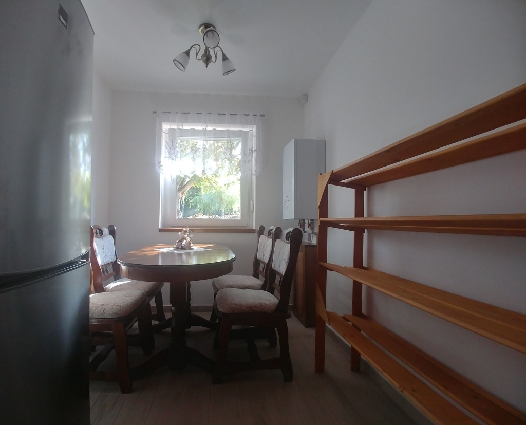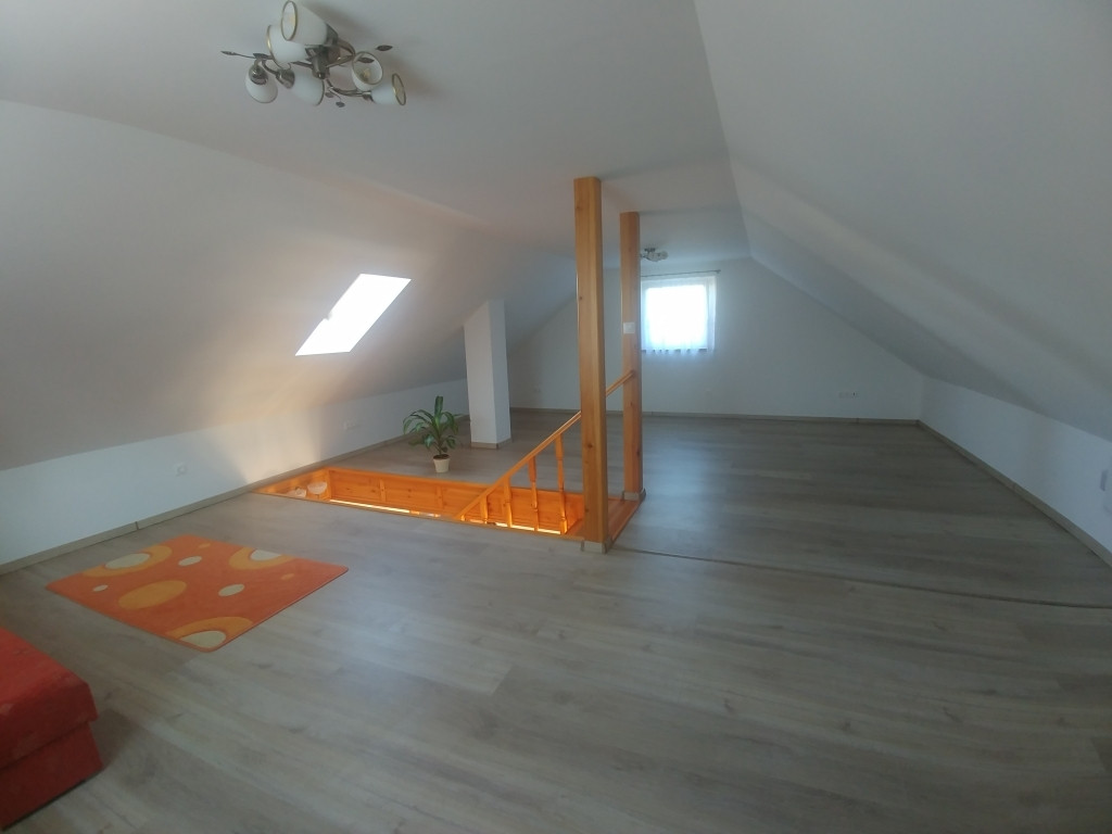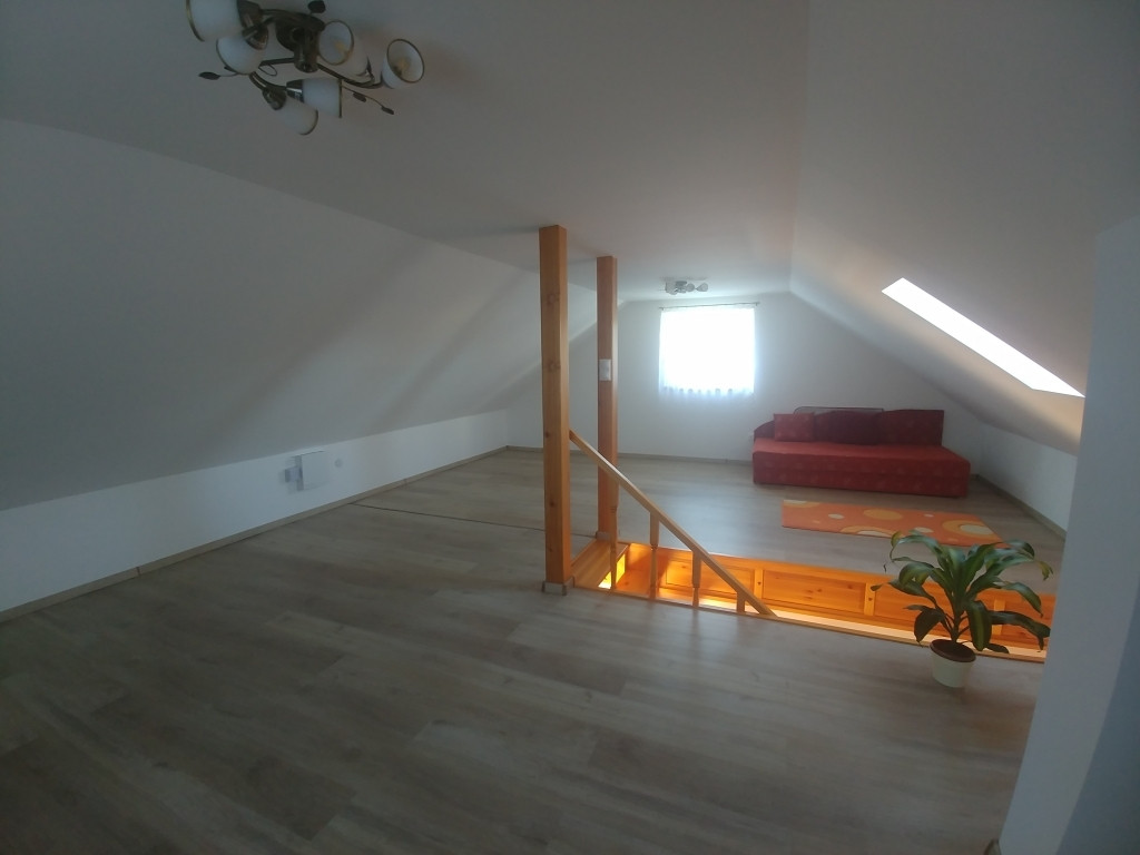 Elrendezése: földszinten fedett terasz (mely beépíthető), előszoba, szoba (9 m2), konyha-étkező (beépített és gépesített diófából készült konyhabútorral), fürdőszoba. Az emelet jelenleg egy légtér, de igény esetén 2 külön nyíló hálószoba alakítható ki.