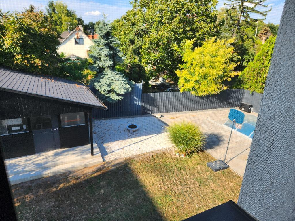 A földszinti lakótér teljesen leválasztható saját bejárattal, terasszal és parkolóval, így akár külön lakásként is használható. Itt nappali, háló funkció, fürdőszoba és mosókonyha kapott helyet, de igény szerint egy konyha is kialakítható benne. Az első emeleten nappali, étkező, konyha, előszoba és dolgozószoba található, valamint egy fedett garázs két autó számára. A kert ezen részén fűtött és fedett medence, szalonnasütő és egy harminc négyzetméteres szigetelt melléképület helyezkedik el, amely műhelyként és konditeremként használható.