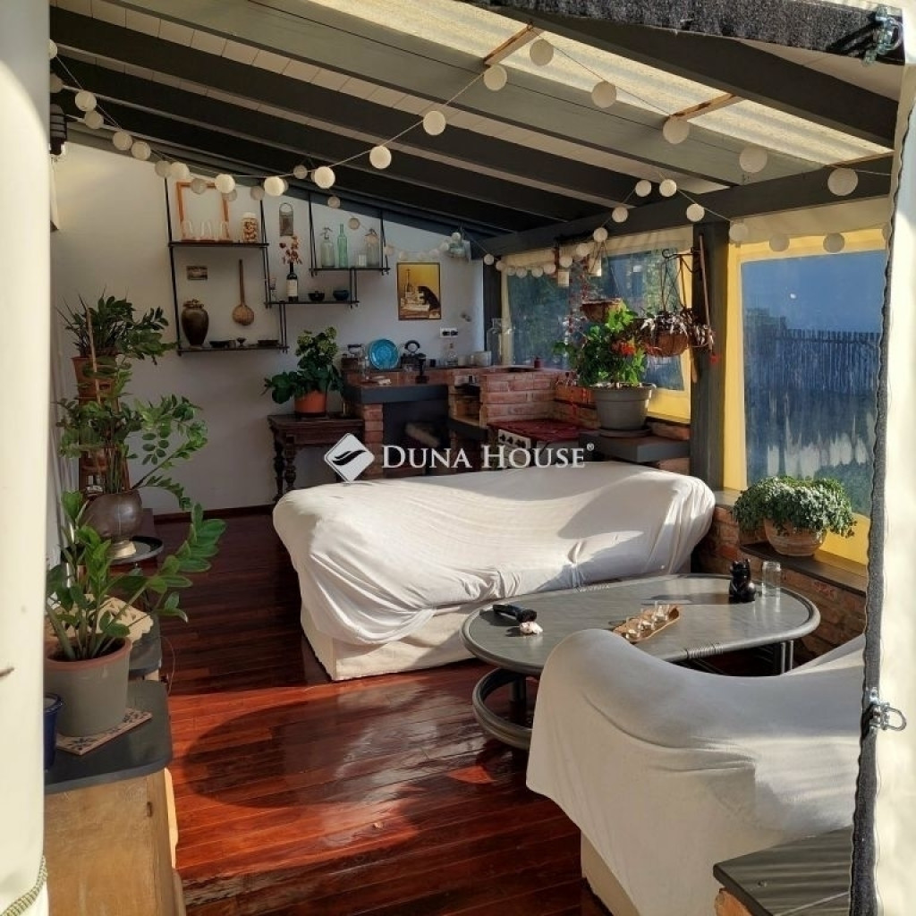 Nappaliból nyíló lakóterasz ponyva védettsége miatt nyári konyhaként + nappaliként áprilistól októberig kiválóan funkcionál!