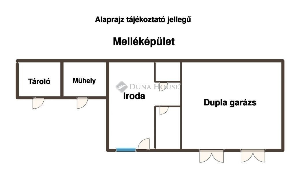 Dupla beállásos garázs, külön bejáratú iroda helyiség, műhely, tároló. Külön lakrész kialakítható.