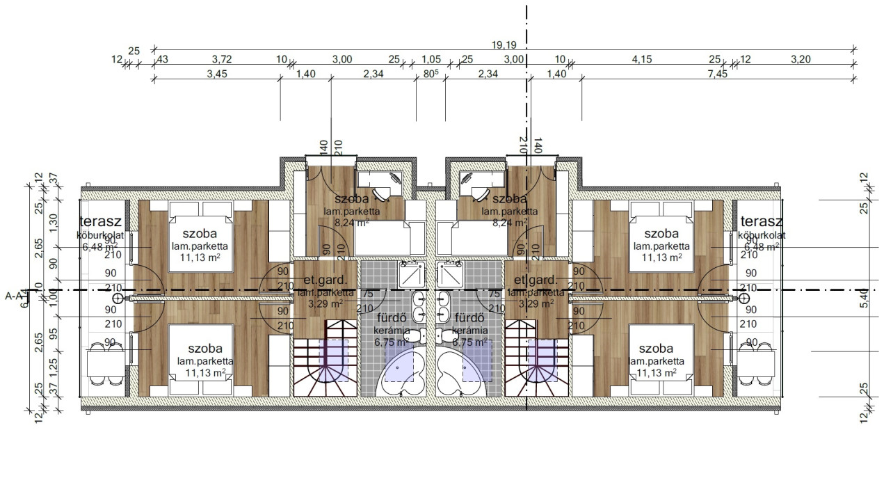 Az emeleten 41 m2-en (+6,5 m2 fedett erkély) közlekedőről nyílóan 3 hálószoba (11,1; 11,1; 8,2 m2) valamint fürdőszoba-WC került kialakításra. A két nagyobbik hálószóbából egyaránt kijárat nyílik az erkélyre.