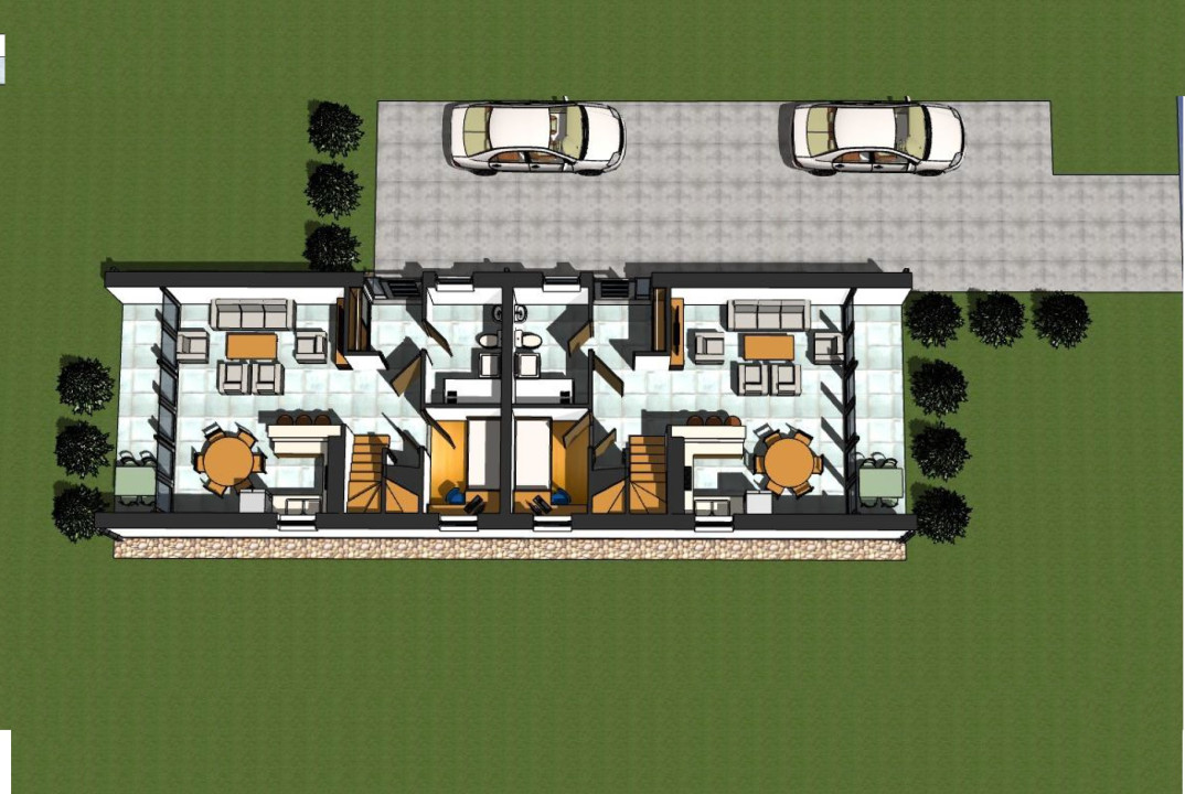 A földszint 41 m2 hasznos lakóterületű + 7 m2 fedett terasz. Előszoba, nappali-konyha-étkező (27 m2), kamra, félszoba (5 m2), 2 fürdőszoba-WC helyiségekből áll.
