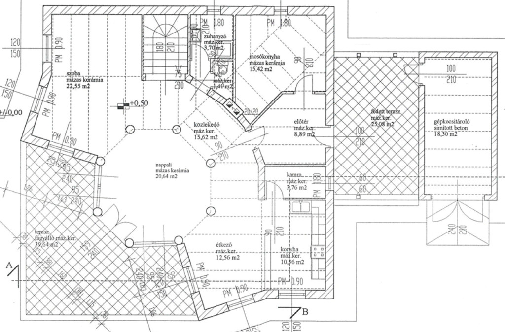 • 60 m²-es DNy-i tájolású, fedett terasz, székely dézsával