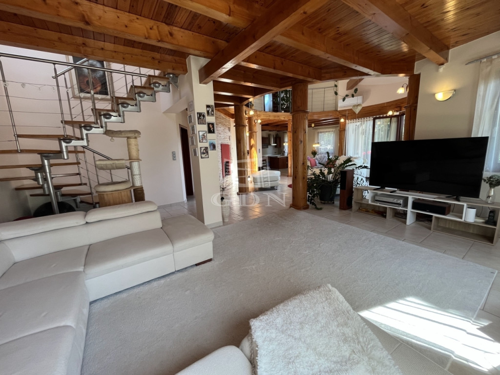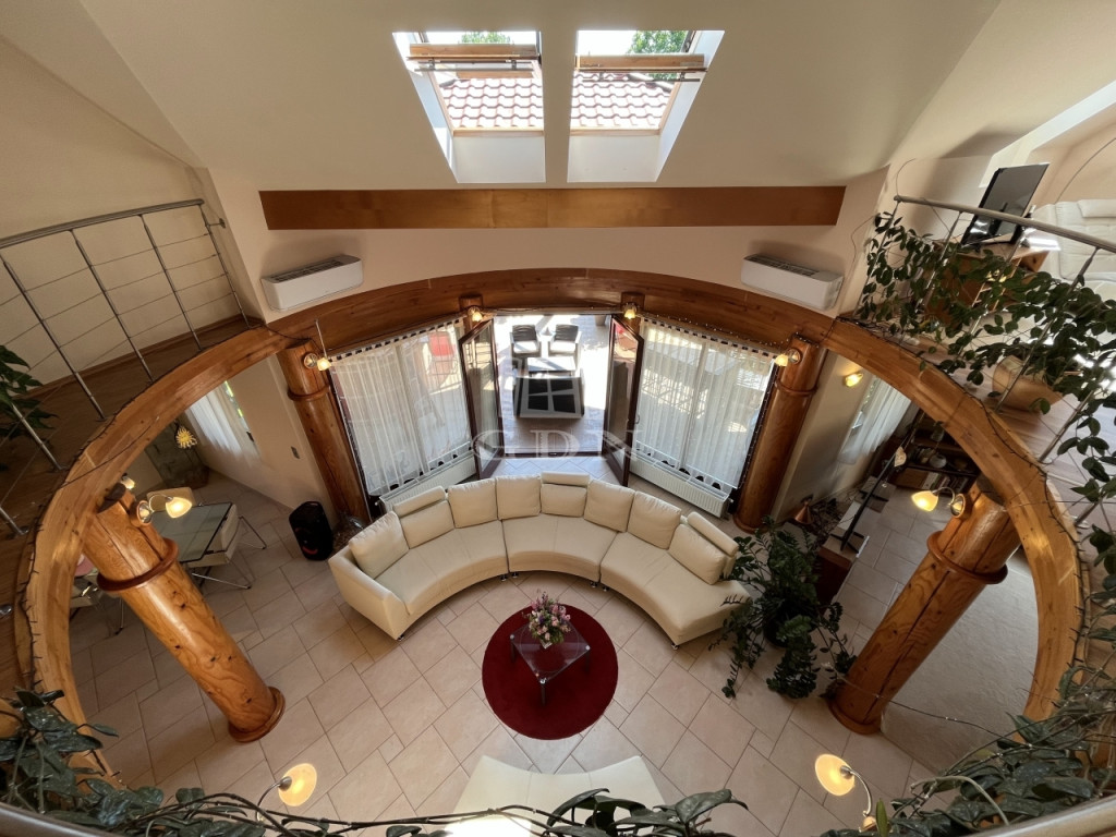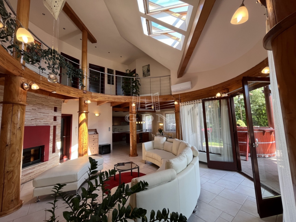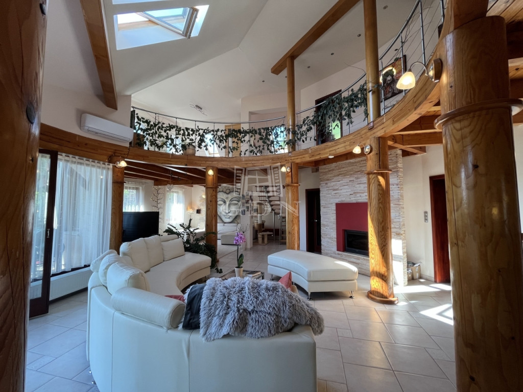 • 6 méteres belmagasságú, különleges kivitelezésű, galériás nappali, kandallóval