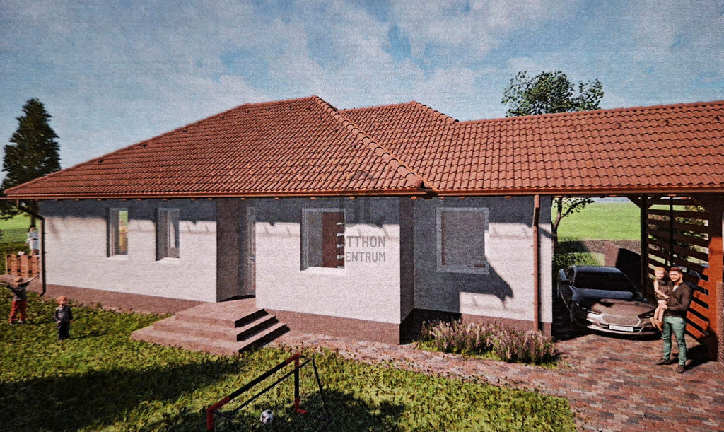 A modern elrendezésű otthon minden helyisége egy szinten helyezkedik el, így kényelmes, akadálymentes mindennapokat biztosít – kisgyermekes családoknak és idősebbeknek egyaránt ideális választás.