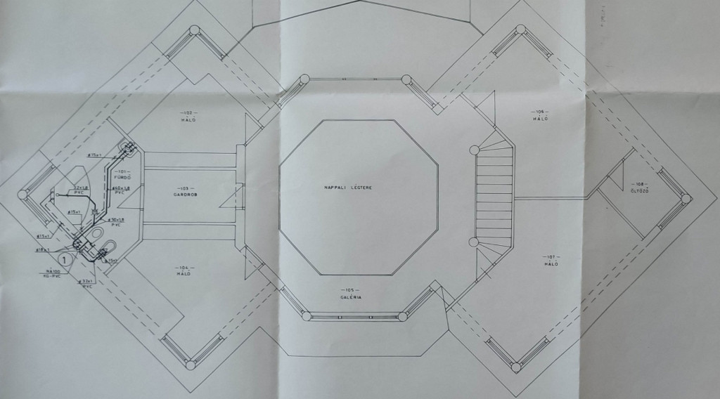 Az épület egyik legmeghatározóbb eleme az egyedi, oktogon formájú tetőszerkezet, amelyet egy közel 4 méteres mestergerenda tart – valódi építészeti kuriózum, amely karaktert és exkluzivitást kölcsönöz az otthonnak.