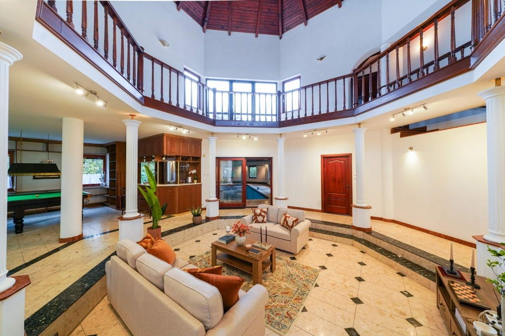 A földszint lenyűgöző, nagyvonalú kialakítása az eleganciát és a funkcionalitást ötvözi. A konyha, az étkező, a bár és a snooker asztal egy légtérben kapott helyet, amely ideális családi és baráti összejövetelekhez. A nappali egy finom szinteltolással, süllyesztett kialakítással válik még hangulatosabbá és intimebbé. A padlófűtés teszi még komfortosabbá az életet ebben a gyönyörű, nagyvonalú házban!