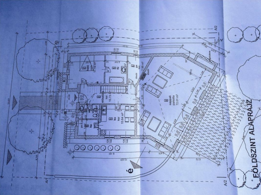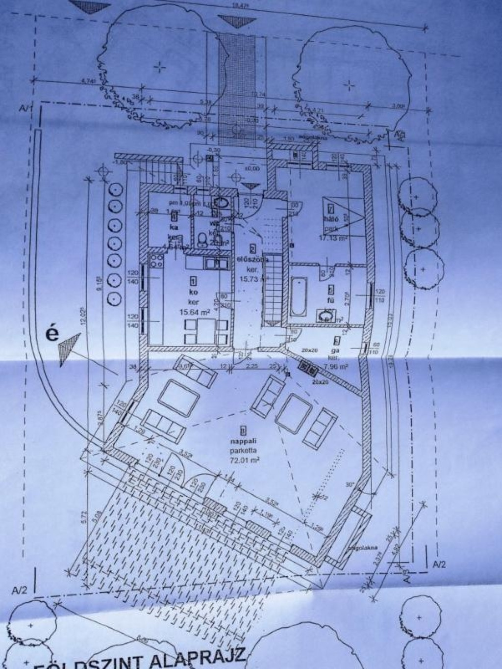 Előszoba 15,73 m2, nappali 72,01 m2, konyha 15,04 m2, kamra 4,64 m2, gardrob 7,96 m2, háló-