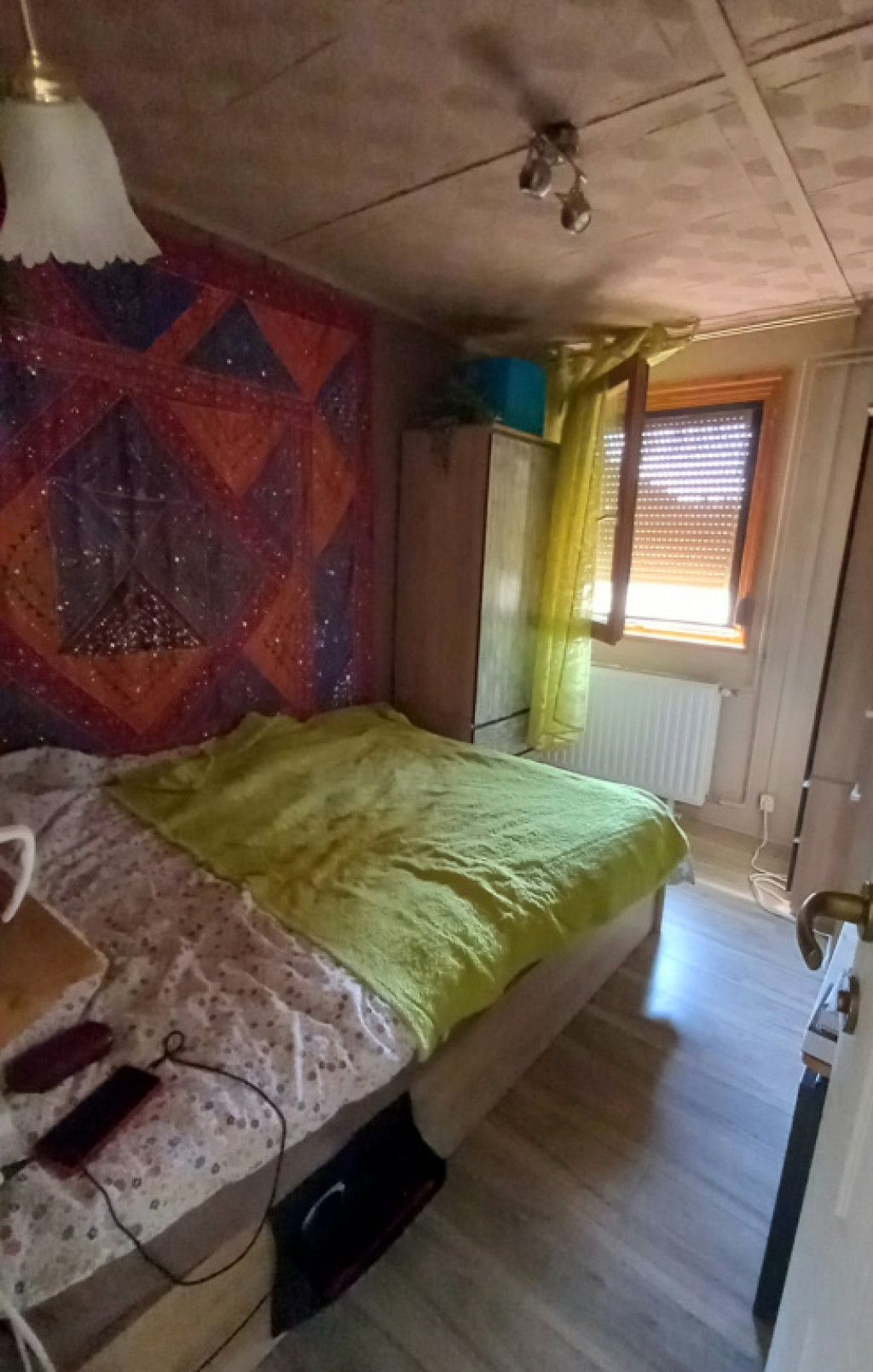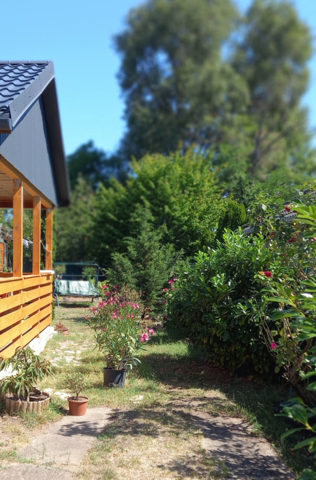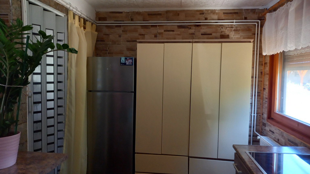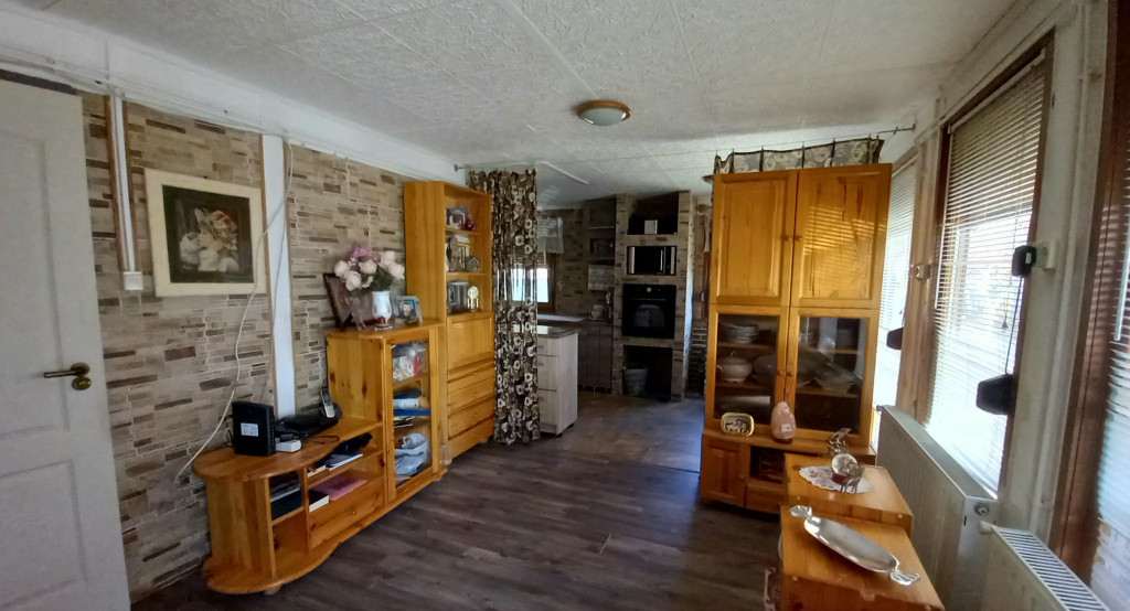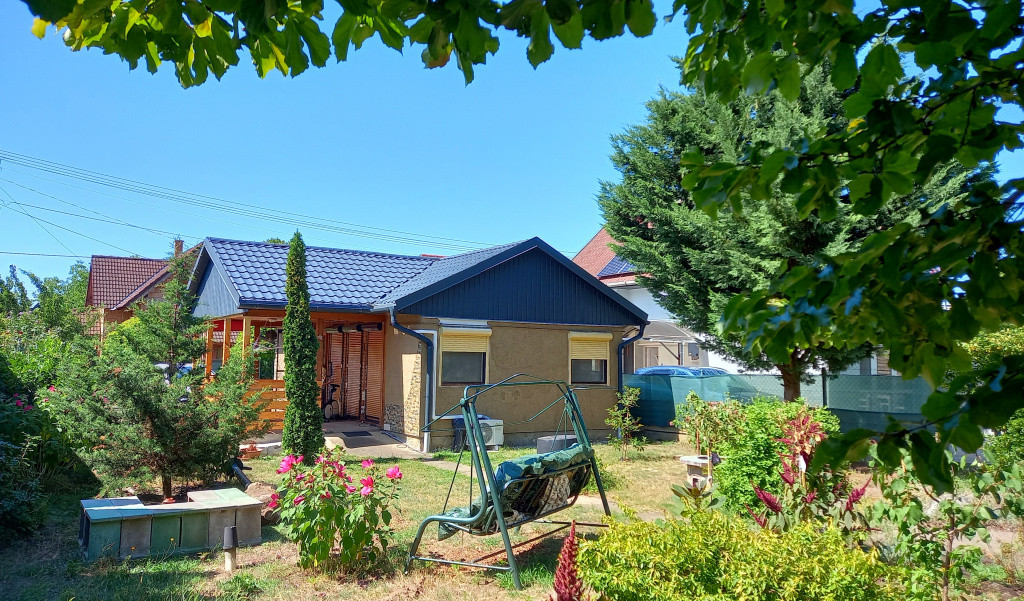 Az épület földszintes, részben FELÚJÍTOTT könnyűszerkezetes, 45 nm-es (+14 nm fedett terasz), 3 szobás, étkezőkonyhás, kamrás. D-Ny fekvésének, hatalmas ablakainak köszönhetően a terek világosak, és az egész csodaszép kertre rálátni.