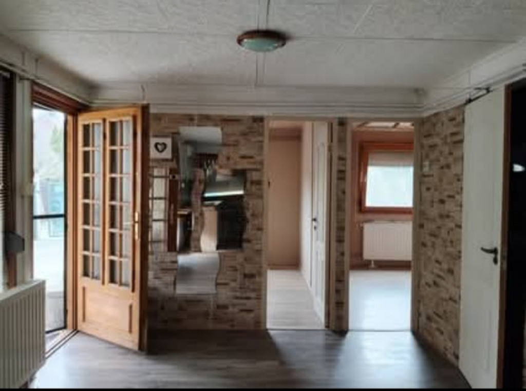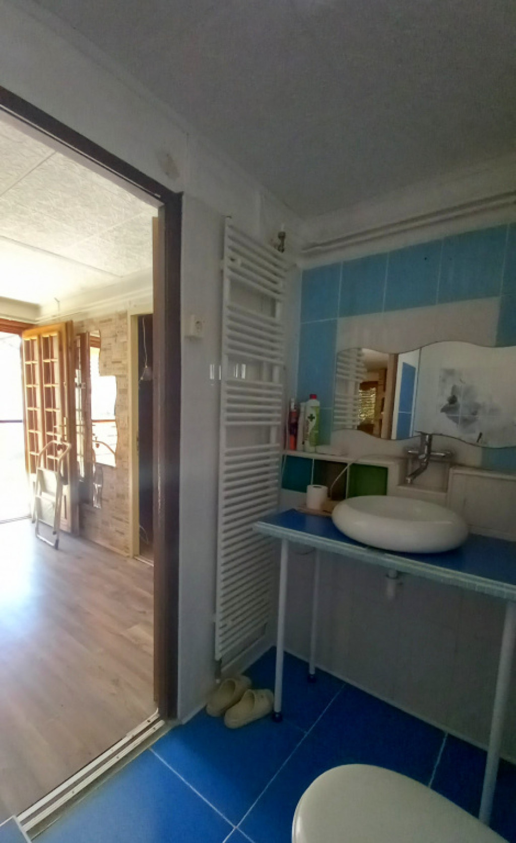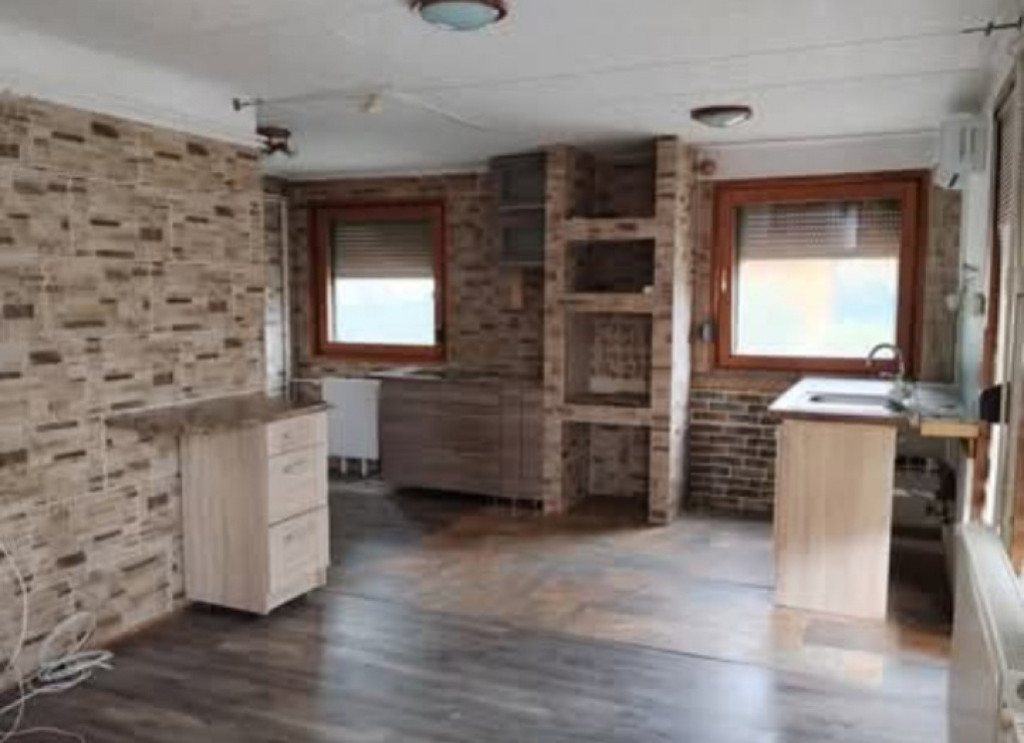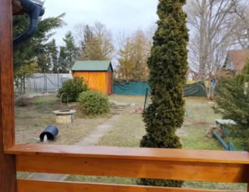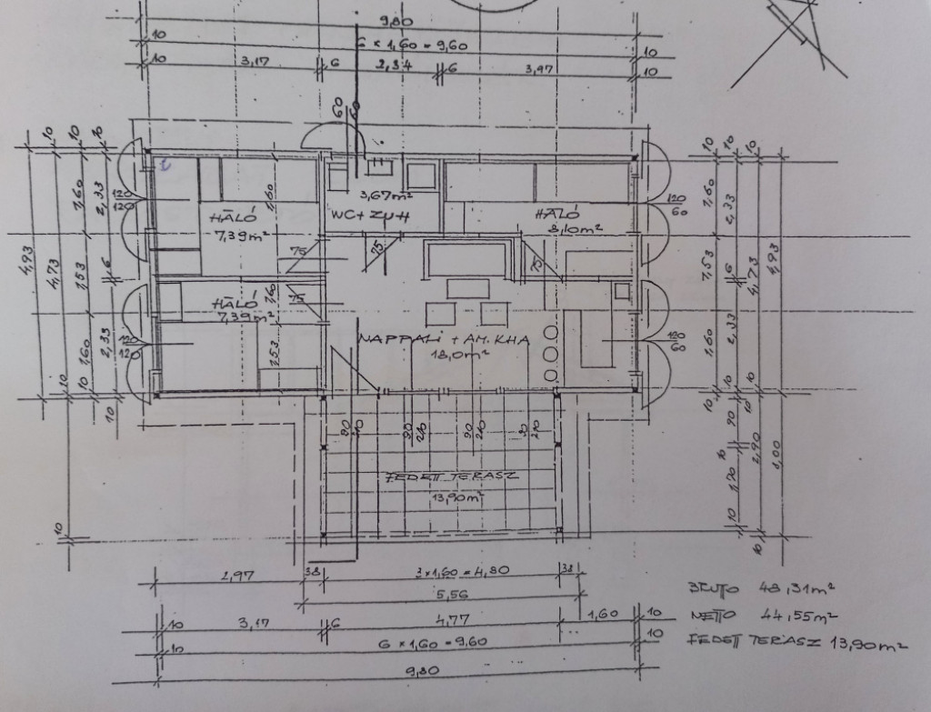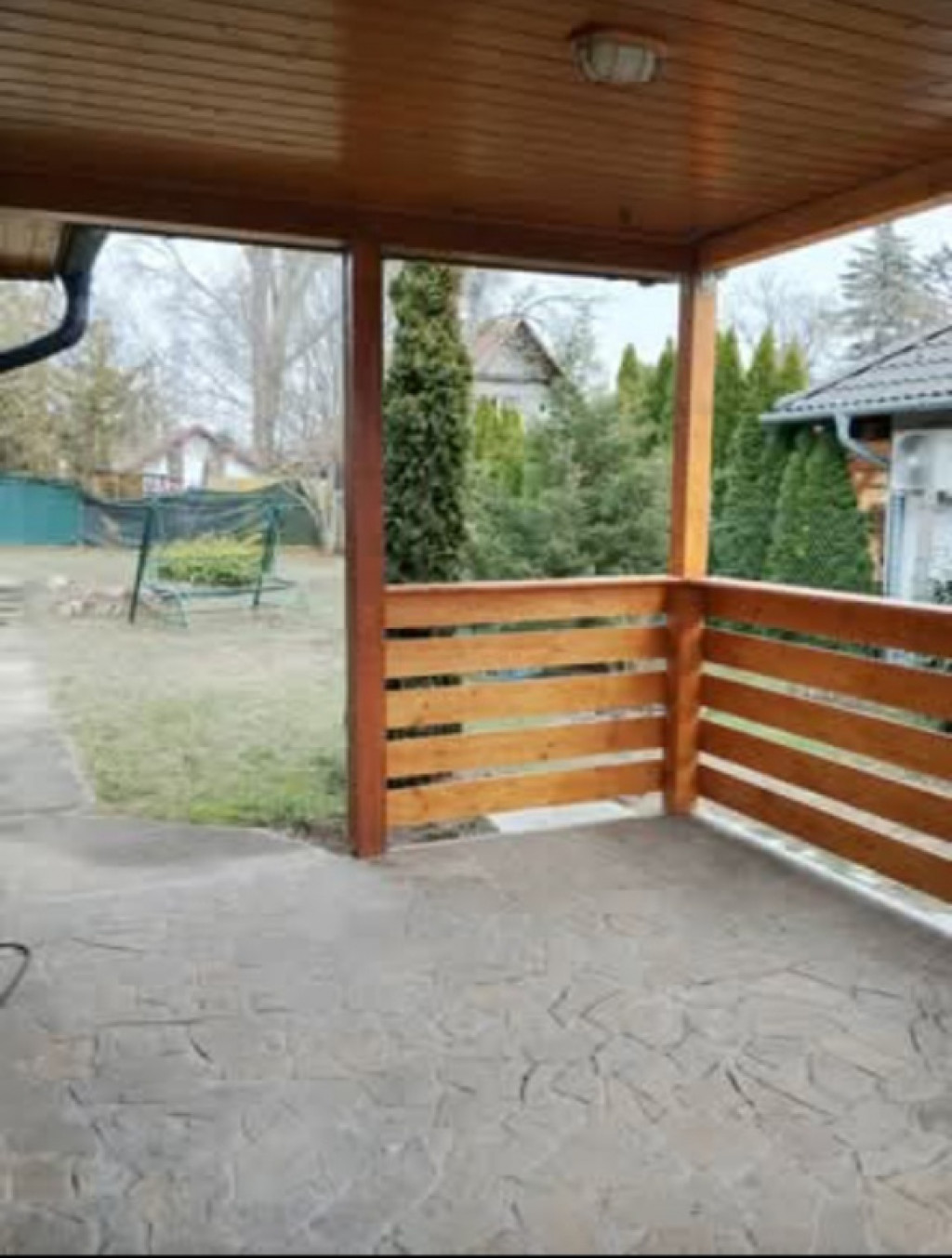 Az épület földszintes, részben FELÚJÍTOTT könnyűszerkezetes, 45 nm-es (+14 nm fedett terasz), 3 szobás, étkezőkonyhás, kamrás. D-Ny fekvésének, hatalmas ablakainak köszönhetően a terek világosak, és az egész csodaszép kertre rálátni.