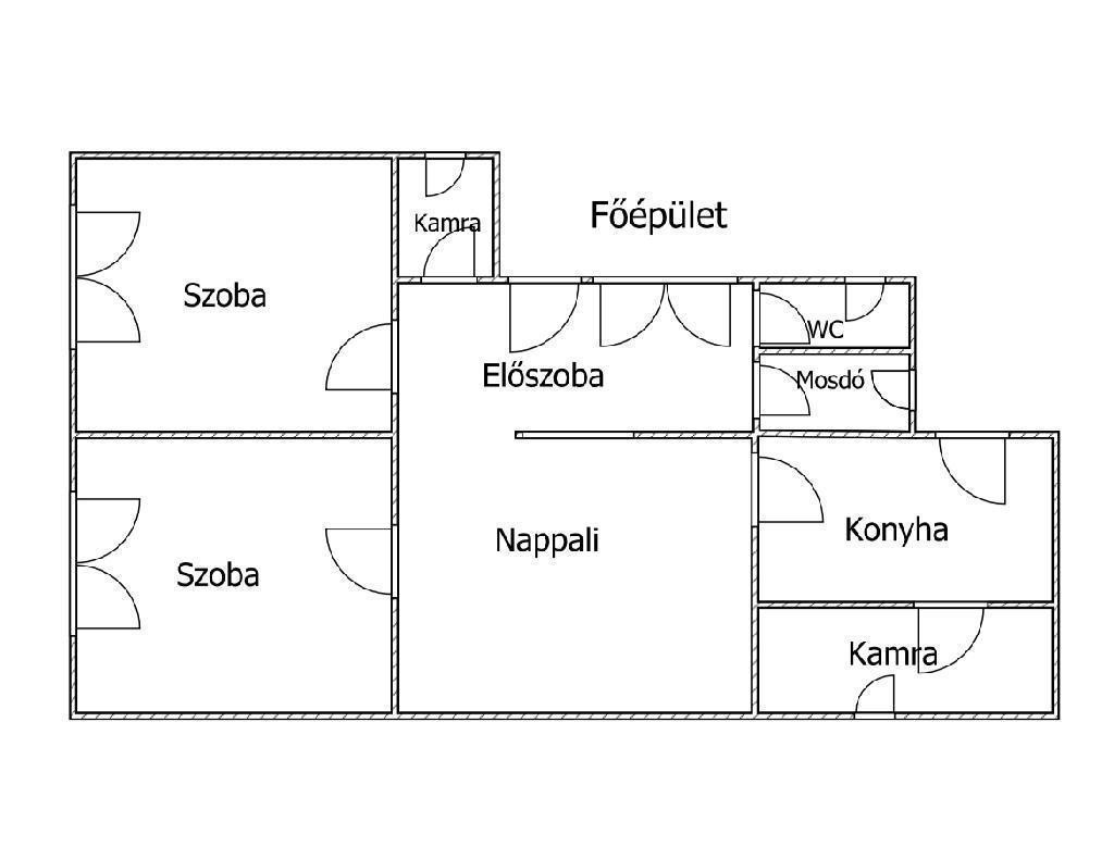 A főépület 75 m?-es, elrendezése praktikus és tágas: két, utcafronti szoba, egy nappali, konyha, közlekedő, külön fürdő és mellékhelyiség, valamint egy kamra található benne.