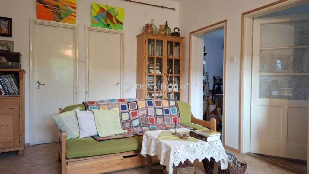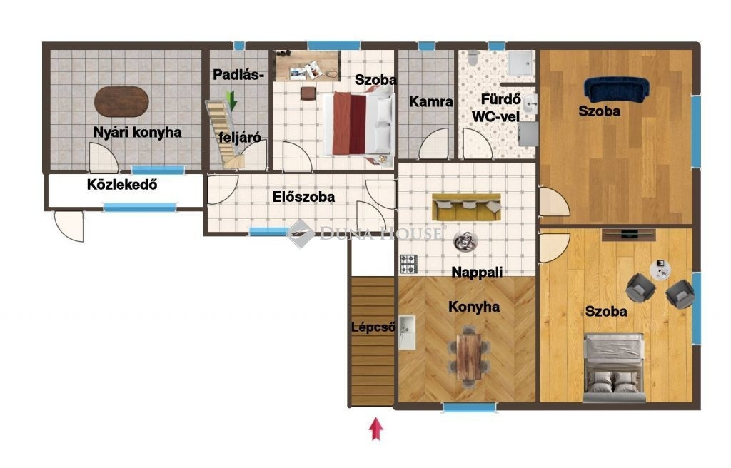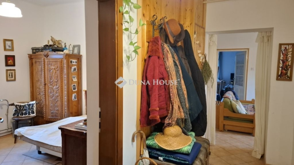 A lakásba néhány lépcsőn át az előszobába lépve, jobbra a nappalit, étkezőt és konyhát magába foglaló nagyobb, világos társasági helyiségbe jutunk. Központi jellegéből adódóan innen nyílik 2 szoba, egy kamra és a fürdőszoba, melyben egy zuhanyzó és a WC is helyet kapott. Az előszobából egy barátságos félszobába és a padlásfeljárót is magába foglaló tárolóhelyiségbe is nyithatunk. Az előszobából egy faburkolatú folyosóra jutunk, ahonnan egy nyári konyhába léphetünk. Tároló funkciót tölt be jelenleg, de akár lakószobává is átalakítható igény esetén.