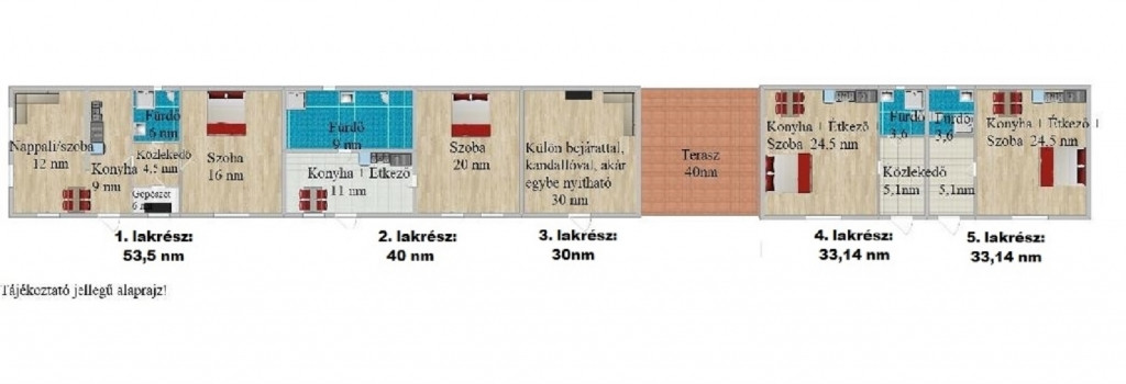 Az ingatlan öt különálló, saját bejárattal rendelkező egységből áll. Négy egység szoba, konyha, fürdőszobából áll.