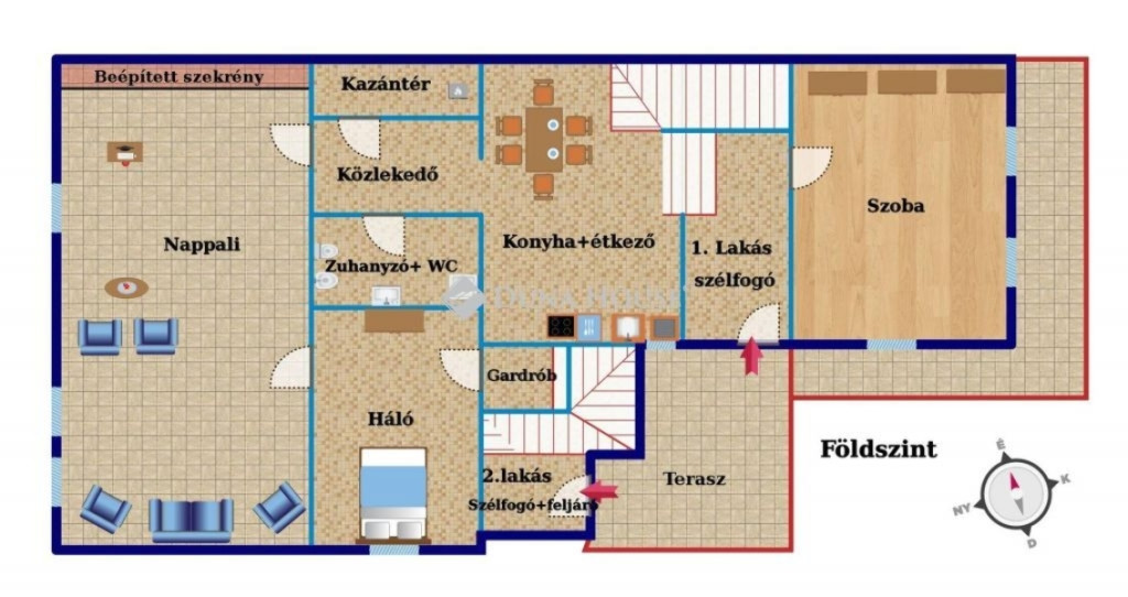 Az eredeti családi ház két szinten több mint 150 m2, míg az új lakás bruttó 69 m2 - nettó 44m2, saját lépcsőházzal. A földszinti nyílászárók kovácsolt vas ráccsal felszereltek.
