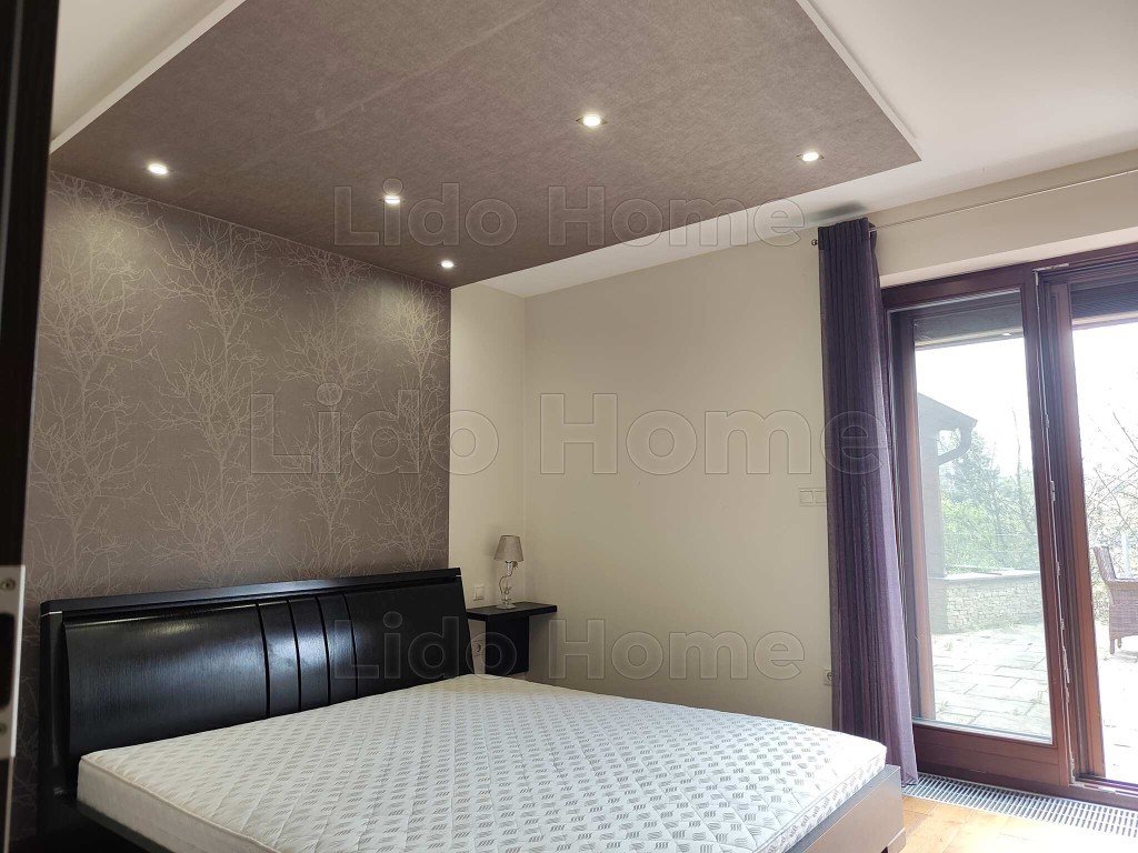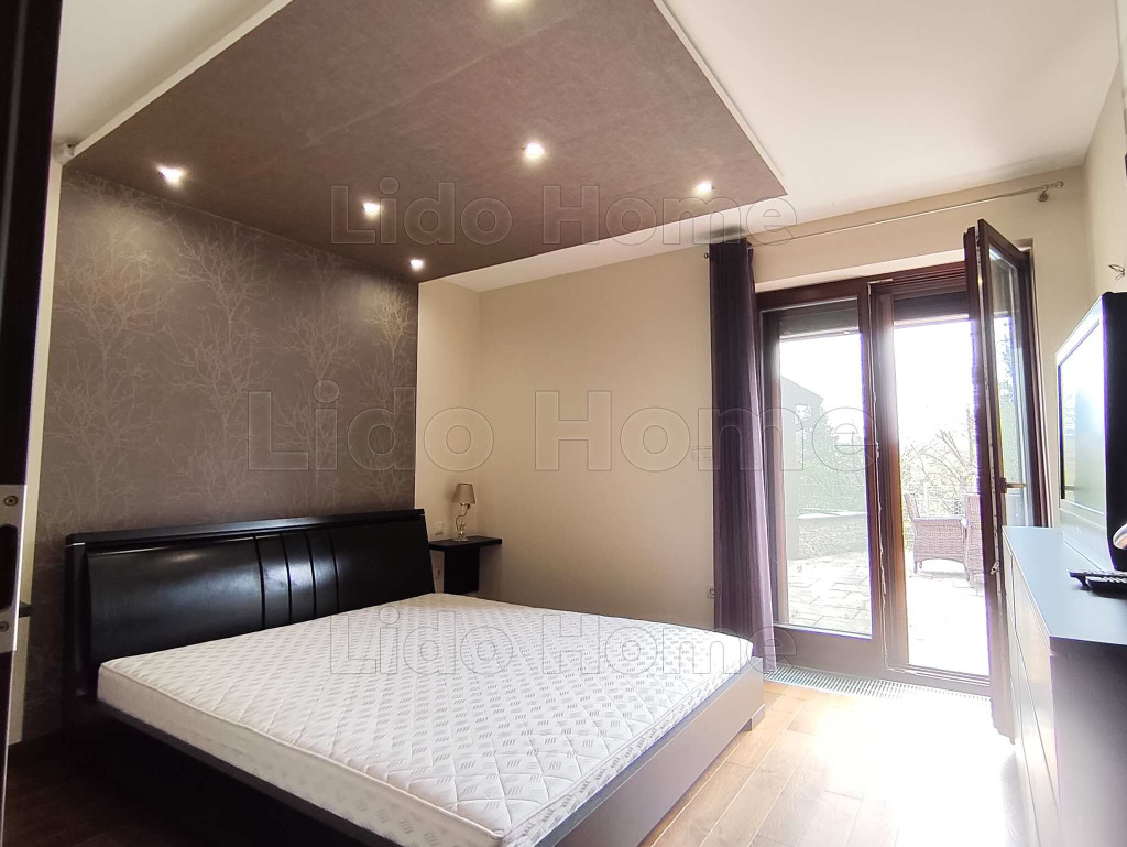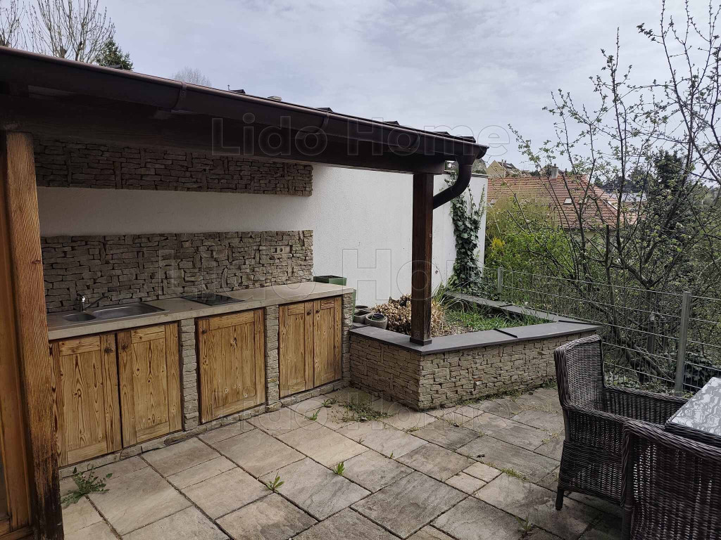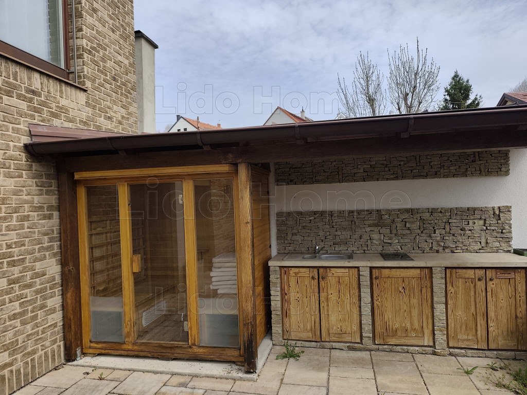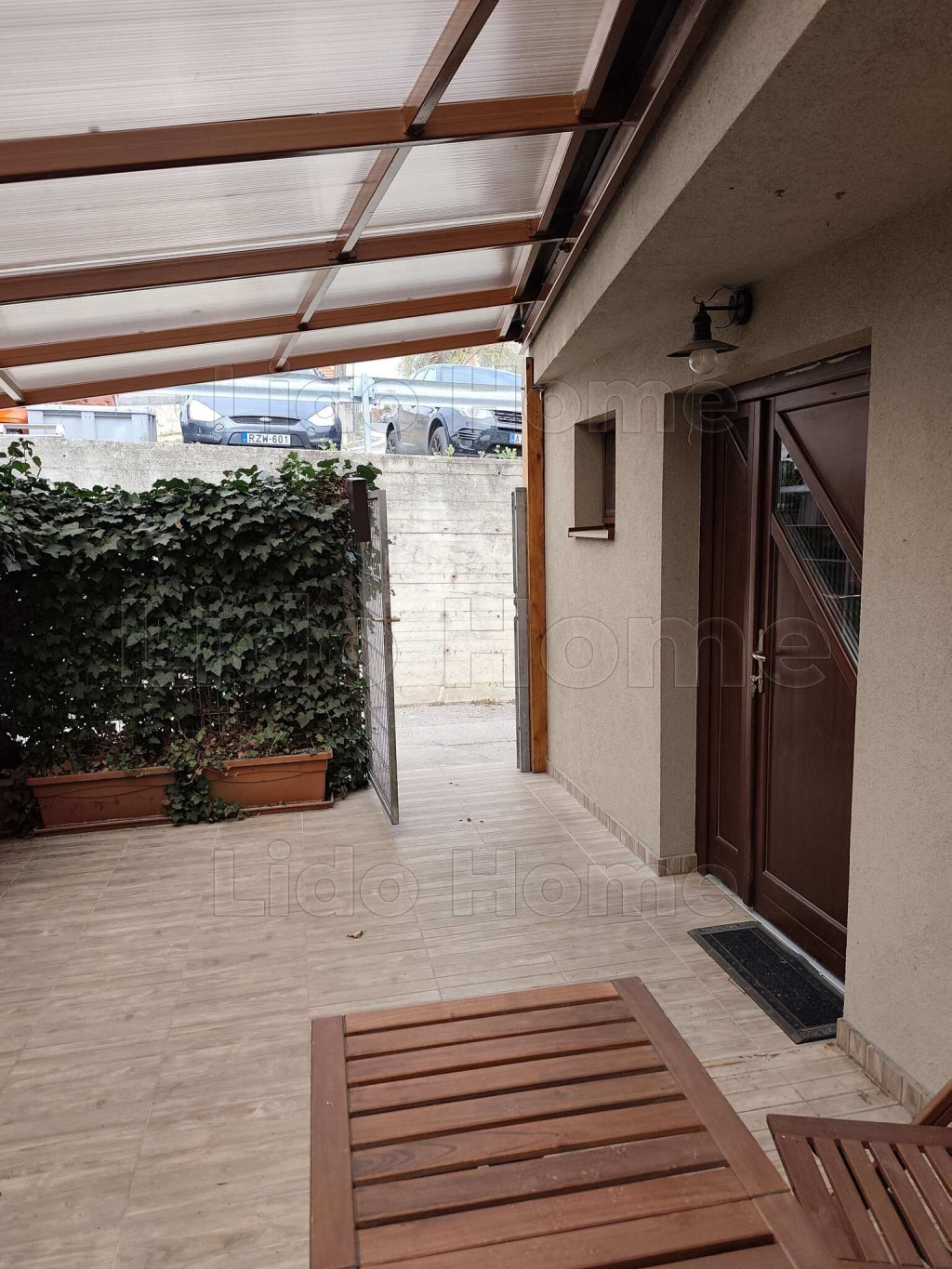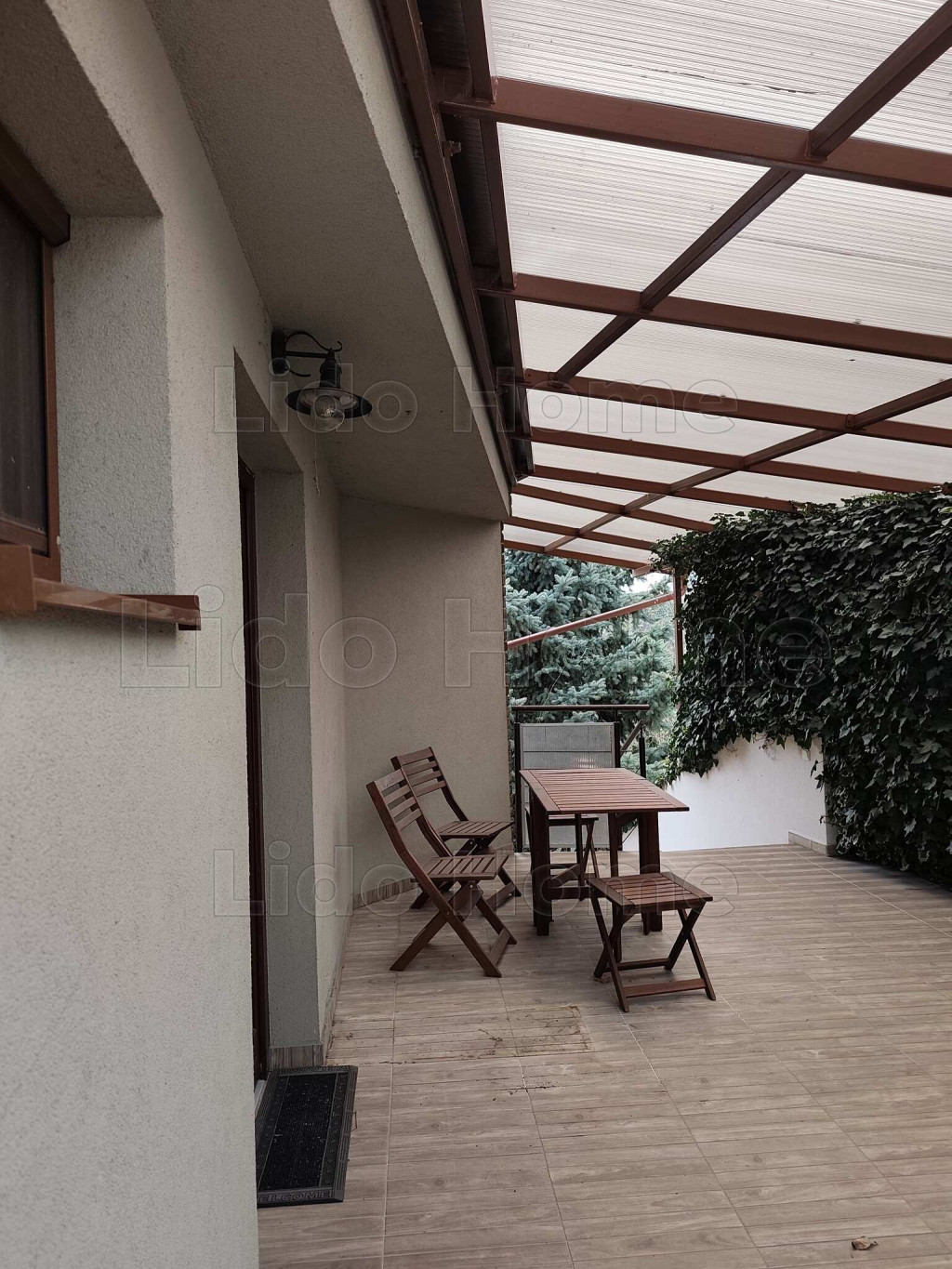 -A kertkapcsolatos szinten két hálószoba, egy nagyméretű fürdőszoba, külön WC, háztartási helyiség és mosókonyha található. A szobákhoz egy tágas terasz kapcsolódik, ahonnan lenyűgöző kilátás tárul elénk a veszprémi várra.