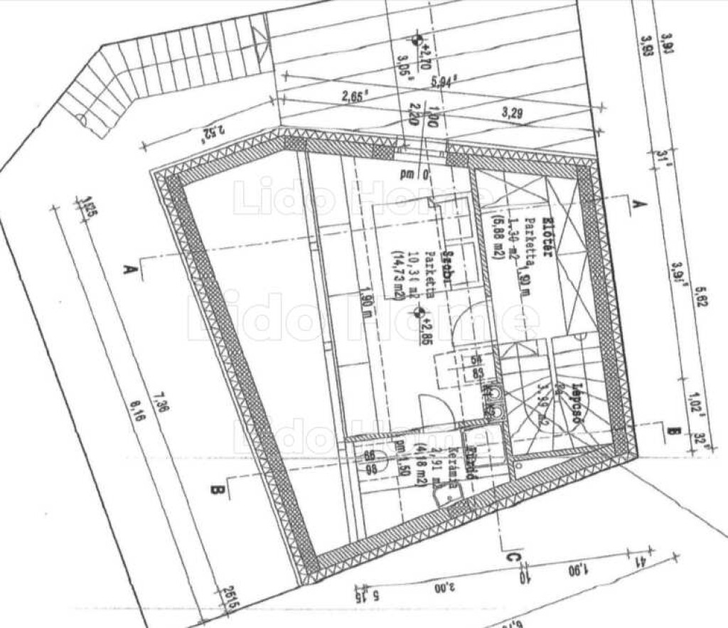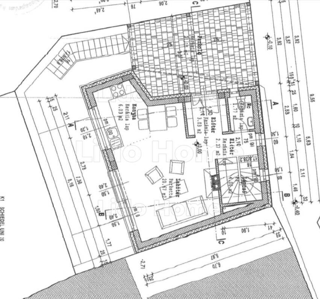 -A tetőtérben egy világos, nagy méretű szoba, előtér, valamint fürdő és WC került kialakításra.