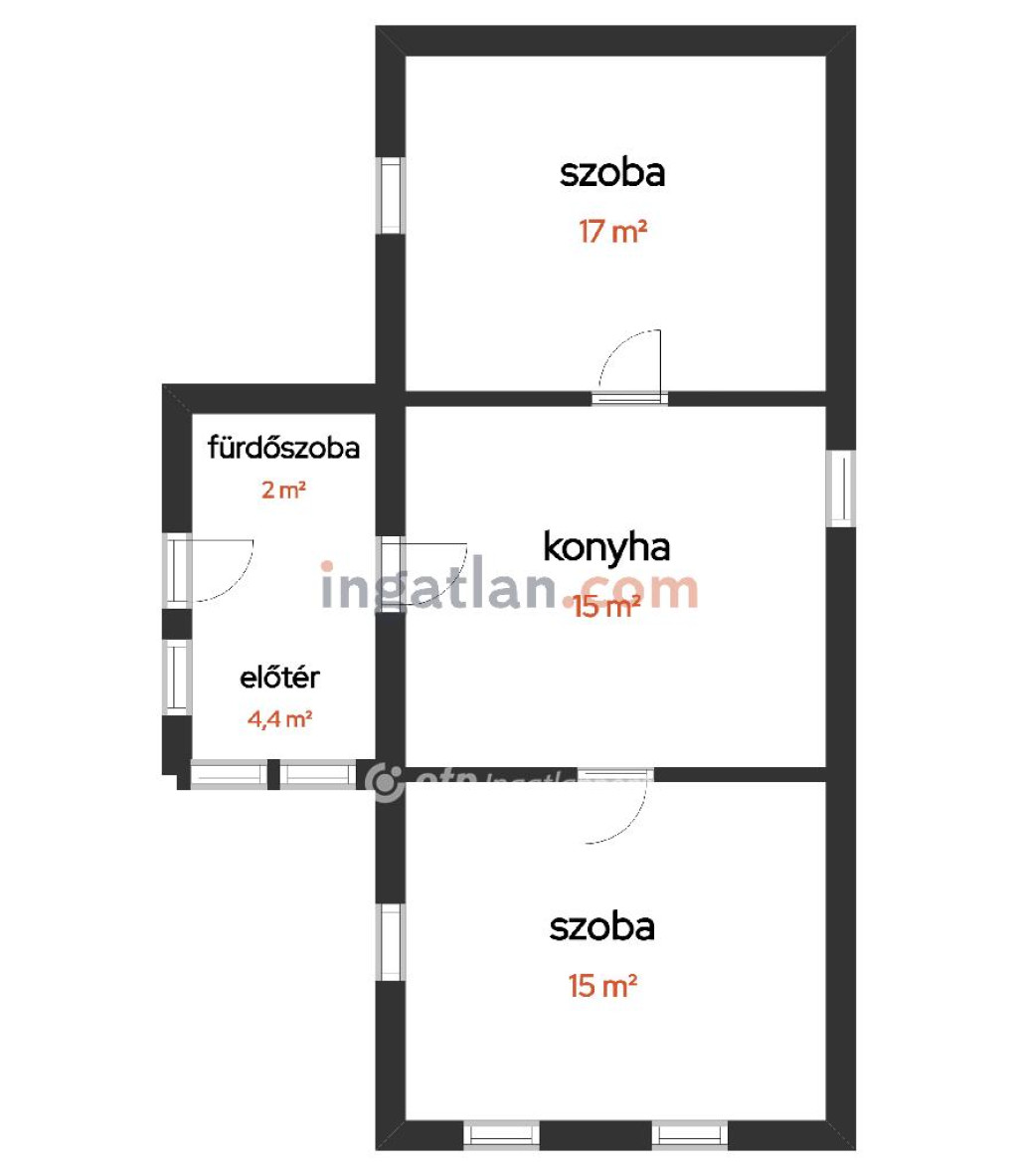 A főépületben két külön nyíló szoba, konyha, fürdőszoba és előtér található.