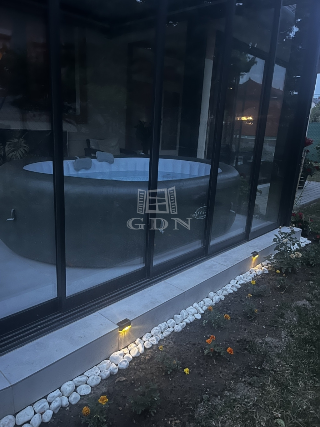 A lakóteret 2024 őszén a Sollis által kialakított ultramodern , elektromos tetőszerkezettel, tolóajtókkal,ZIP árnyékolókkal és 25 m²-es télikerttel egészítették ki, melybe 7 személyes jacuzzi és pihenő-olvasó sarkokat is beépítettek. Az emeleten egy 2 m²-es erkély teszi még vonzóbbá a Balatoni panorámát. A fűthető télikert ideális hely a kávézáshoz, nyugodt olvasáshoz,home office munkához vagy pihenéshez minden évszakban.