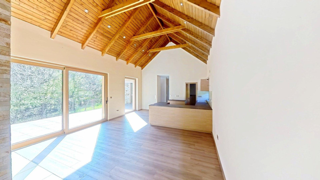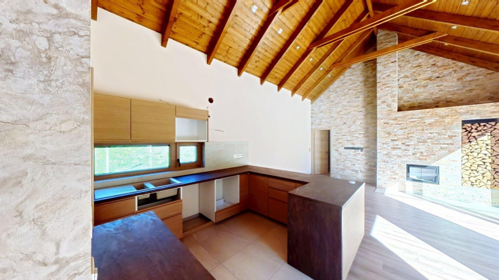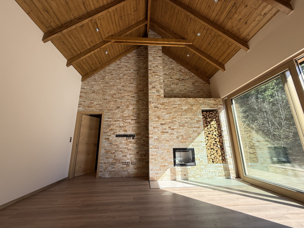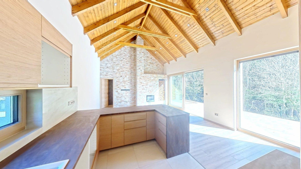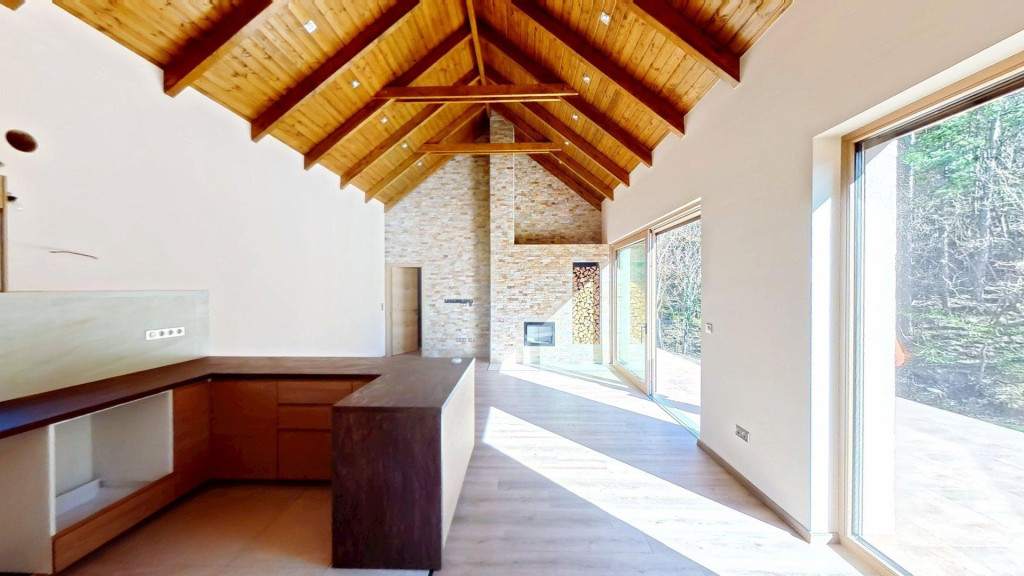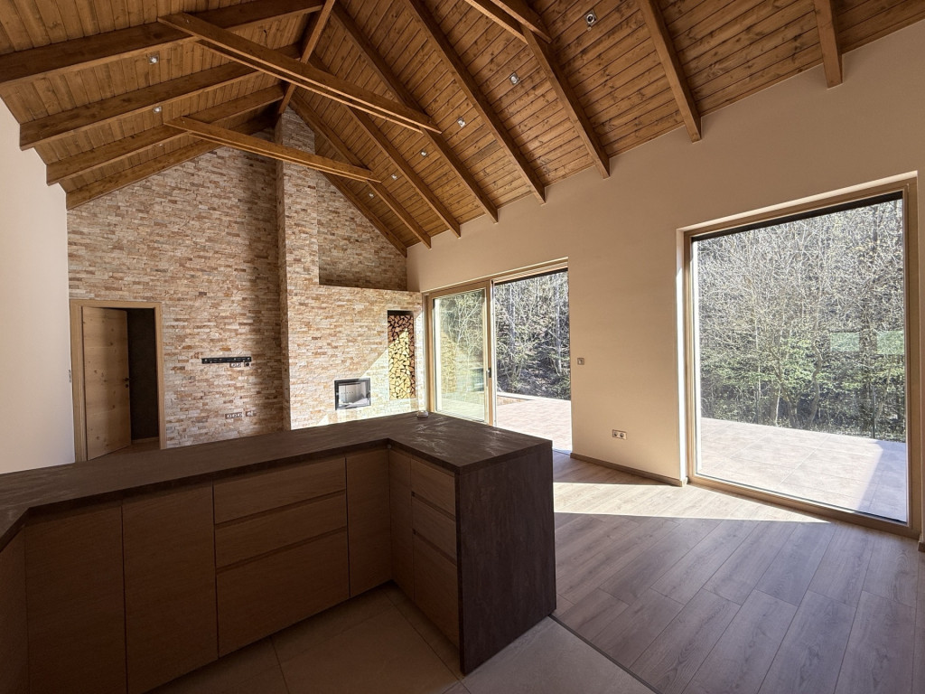 A családi együttlétek színtere lehet a nagy belmagassággal rendelkező amerikai konyhás nappali közvetlen terasz- és kertkapcsolattal, ahol a természet közelsége és az igazi otthon érzése találkozik: a fatüzelésű kandallónak és panoráma ablakoknak köszönhetően az erdő minden bája beköltözik a nappaliba.