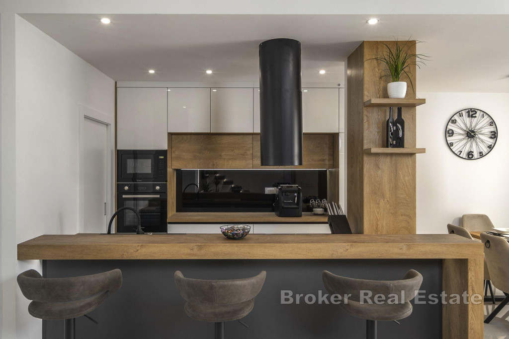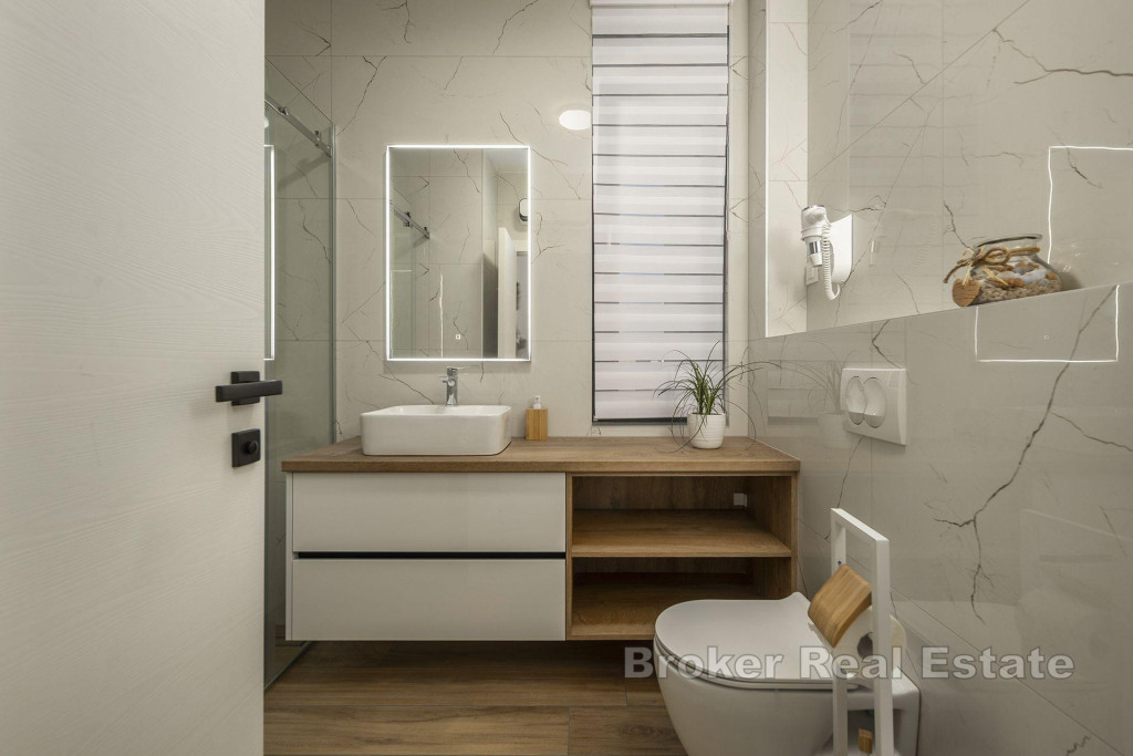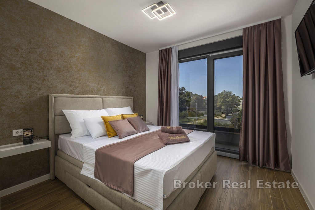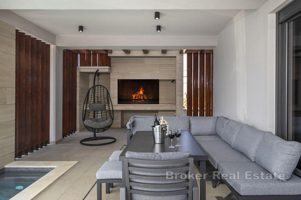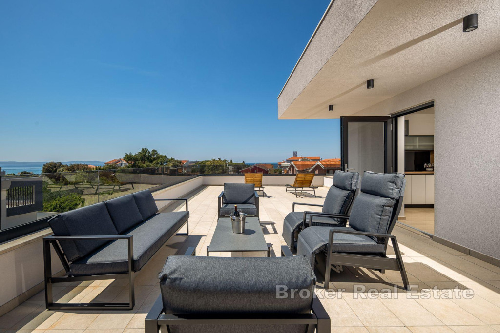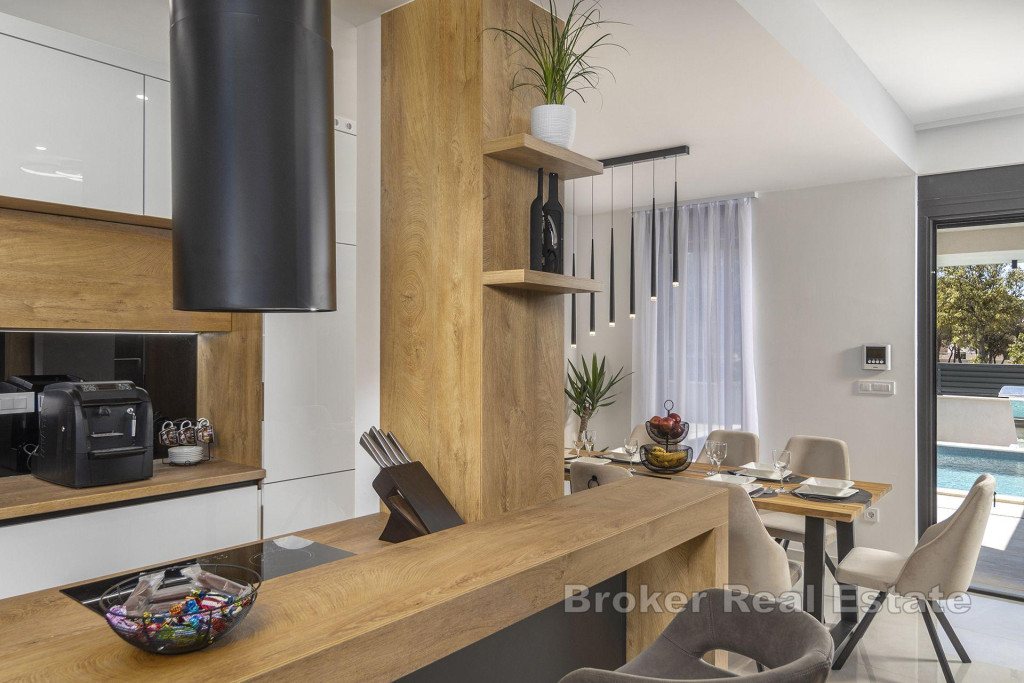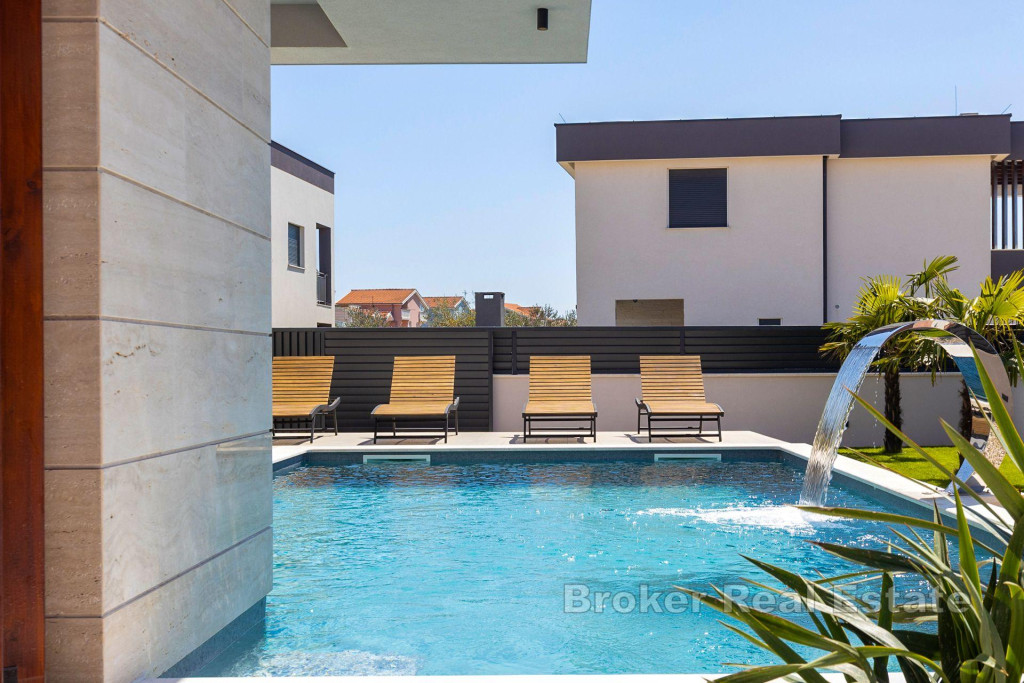 The exclusive modern villa, built in 2022, is situated in a peaceful environment in one of the most desirable coastal areas. With a surface area of 466 m2, spread over three levels (basement, ground floor, and first floor), this impressive residence offers a total of 225 m2 of living space. The refreshing combination of elegant design and functionality makes it an ideal place for relaxing vacations or enjoying comfortable year-round living. On the ground floor, there is a well-equipped kitchen, a spacious dining room, and a living room that connects to an outdoor covered terrace through sliding glass doors – a perfect setup for socializing, especially during the summer months. The first floor offers three spacious bedrooms, each with its own bathroom and access to a balcony, providing intimacy and comfort for the residents. In the basement of the villa, there is a true wellness oasis with a sauna and a gym. The gem of comfort is the irresistible roof terrace, which can be reached by internal stairs and offers a spectacular view of the sea and the surrounding area. The villa’s yard, fenced for privacy, offers enjoyment with a 32 m2 heated pool, a sunbathing area, a fireplace corner, a covered terrace, and parking for two cars. For added comfort, the villa is equipped with heating and cooling air conditioners, while underfloor heating provides warmth in the living room, bathrooms, and gym. This elegant property comes fully furnished, providing a sophisticated and comfortable living space. The city of Zadar is only a 15-minute drive away, while Zadar Airport is 30 minutes by car, making this villa a perfect blend of luxury and convenience. BROKER REFERENCE ID:2018/245