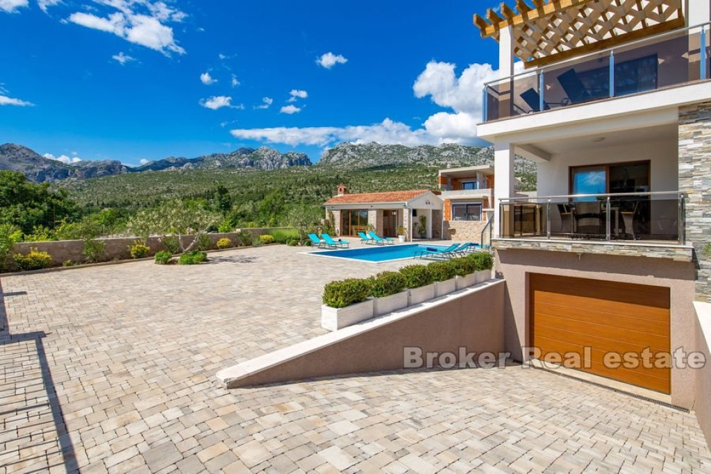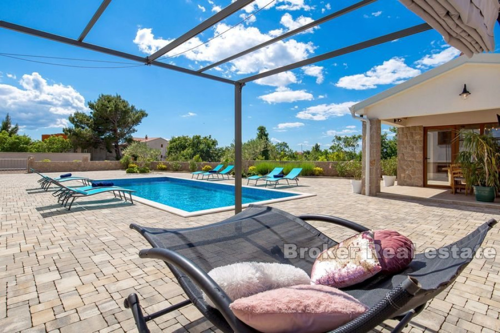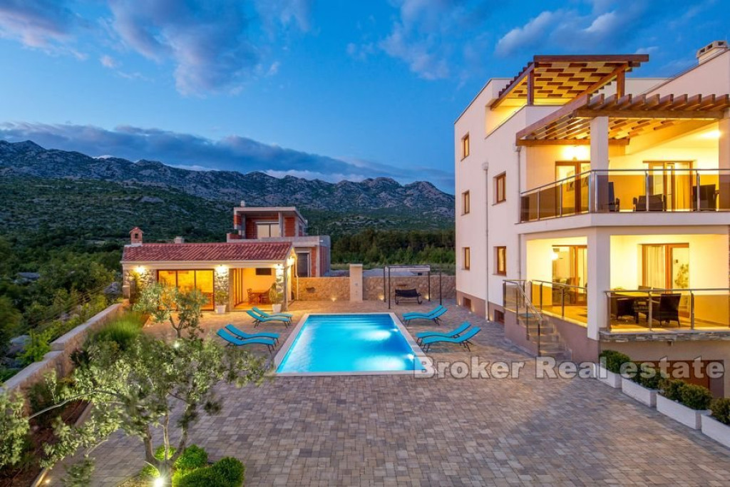 Beautiful villa for sale of 400 m2 located on a plot of 710 m2. The villa spreads over a total of 3 floors and a basement. In addition to the villa, on the plot there is an auxiliary building with a fireplace and a summer kitchen from which there is a direct exit to the yard and the pool where the heating system is installed. In addition to the heat pump, the house is equipped with underfloor and solar heating. On the minus floor there is a basement, bathroom, boiler room, bathroom, garage with two parking spaces and an additional 2 rooms that can be converted into bedrooms. In addition to the garage, the outside of the house is spacious enough for a minimum of 2 parking spaces. On the ground floor there is a kitchen, dining room, living room and bedroom with private bathroom. From the living room there is a direct exit to the terrace with a summer kitchen of 45m2. The first floor is dominated by 3 bedrooms, one of which has its own bathroom and the other two have a shared bathroom. There is an exit to a large covered terrace, to which two bedrooms have access. On the second floor of the house there is a sauna and an additional entrance hall that can be converted to tenants liking. On the same floor, on a partially covered terrace, there is a jacuzzi, furniture and a sun deck, which can be enjoyed with a view of the sea that is located nearby. Almost all floors offer a view of the sea, which is only 200 meters from the property. Due to all the included facilities, the house is ideal for family getaway or tourism purposes. The pleasant and peaceful landscape in which the house is located in no way affects the distance of essential amenities for living. The location of the property is really interesting because it offers a view of Velebit from the north and the sea from the south. BROKER REFERENCE ID:2043/20