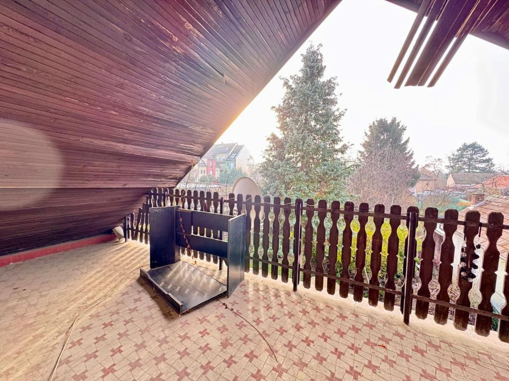 A nappaliból csigalépcső vezet a tetőtérbe, ahonnan egy tágas, fedett terasz nyílik. A terasz mögött padlástér található, amely további bővítési vagy tárolási lehetőséget kínál.