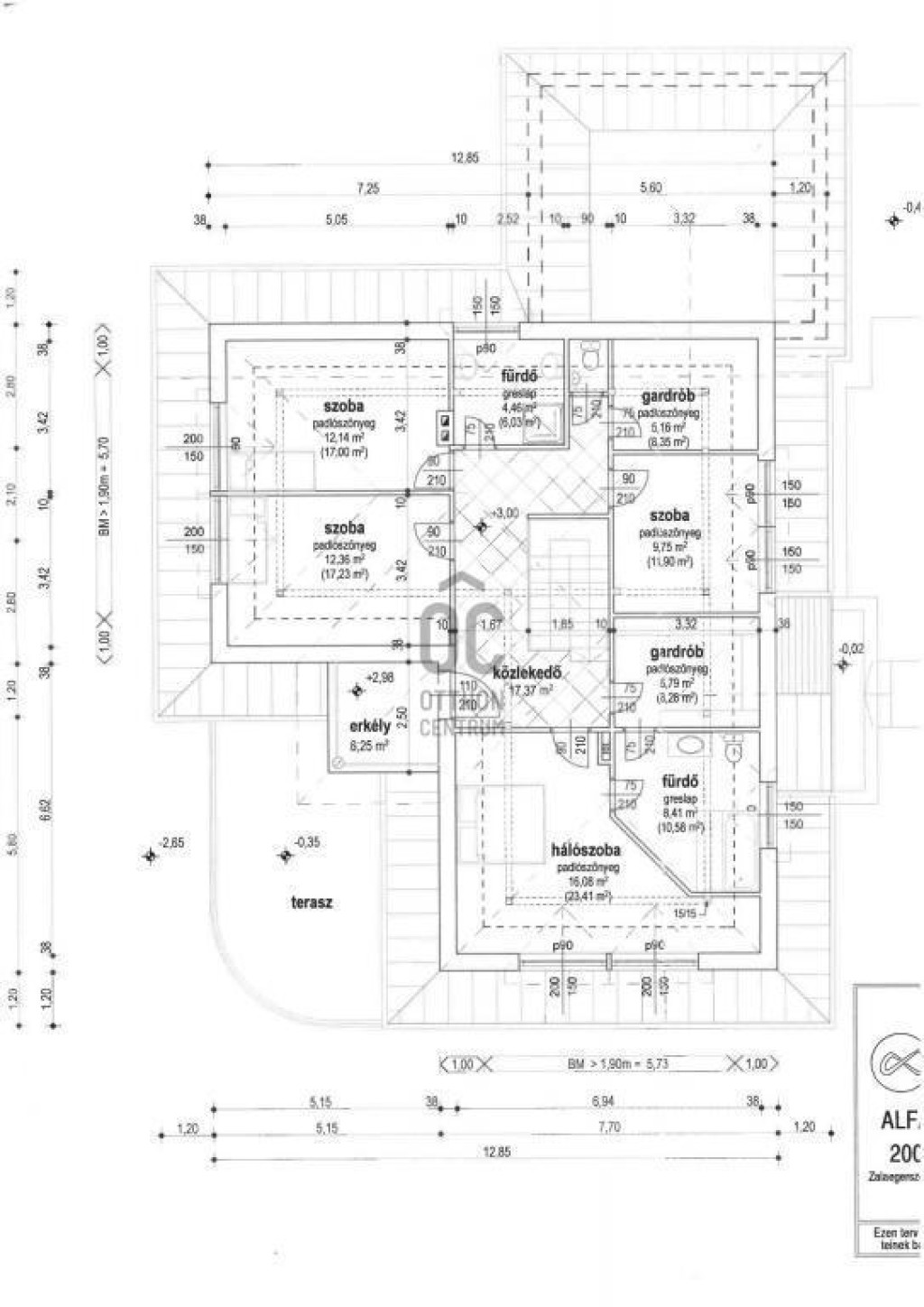 A tetőtéri szint nettó 92,52 m2-es, bruttó 120,15 m2, ezen kívül egy 6,25 m2-es erkély került kialakításra, 4 négy szobával, kettő fürdővel és kettő gardrób szobával.