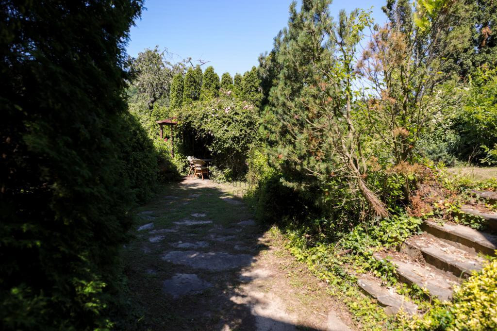 Felső részére épült a három szintes ház, a középső részen gondozott, hangulatos kert, halastó, az alsó részen pedig saját kis erdő.