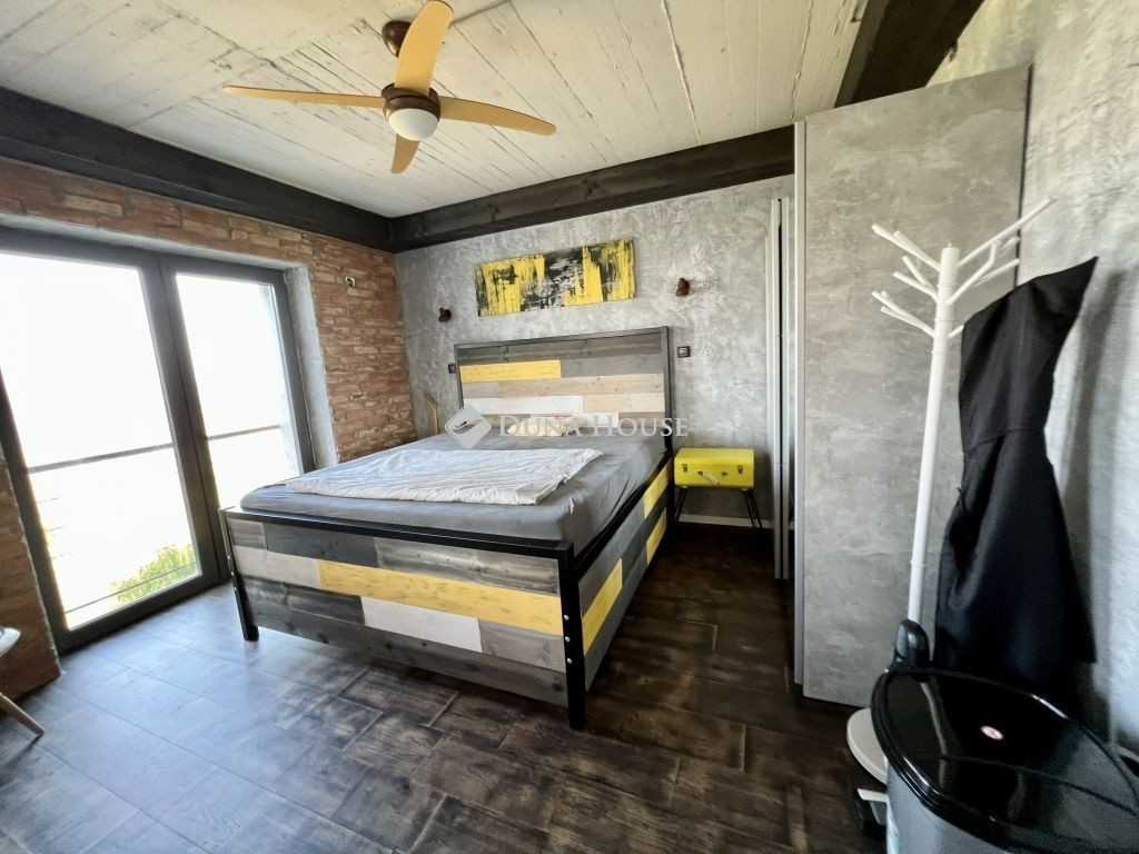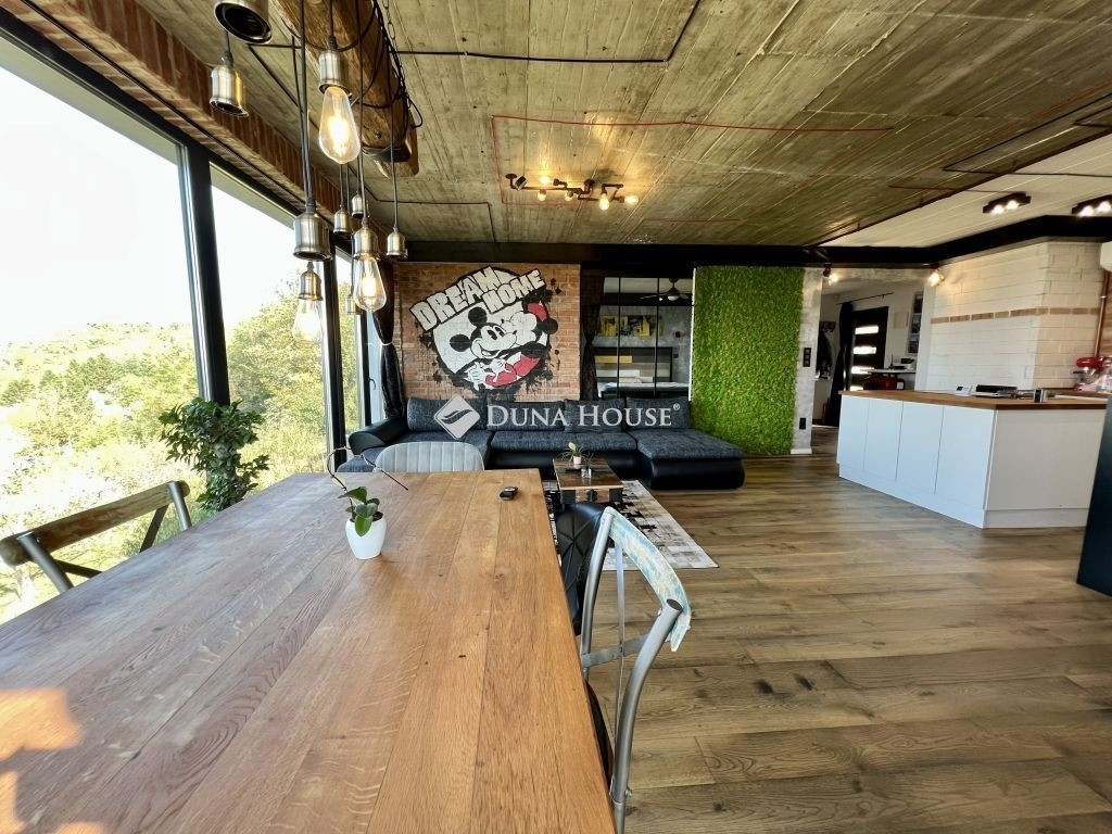 A loft jellegű, tégla építésű ingatlan nagy belmagasságával és nyitott tereivel azonnal magával ragadja az embert, miközben az ablakokból elképesztő panoráma nyílik a környező vidékre.