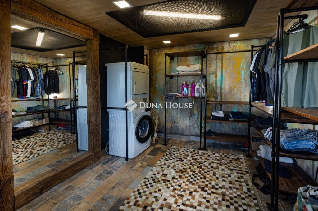 Az ingatlan felső szintjén található egy tágas hálószoba, egy wc és a nagyméretű amerikai konyhás nappali. A nappali közel 50 m², amely igazi közösségi térként szolgál. A beépített akvárium és az egyedi burkolatok különleges hangulatot kölcsönöznek. A nappaliból egy 15 m²-es teraszra léphetünk ki, ahol csodás kilátás vár ránk a környező tájra. Ez a szint ideális a családi élet és a szórakozás színhelyéül, ahol a nyitott tér maximális kényelmet biztosít.