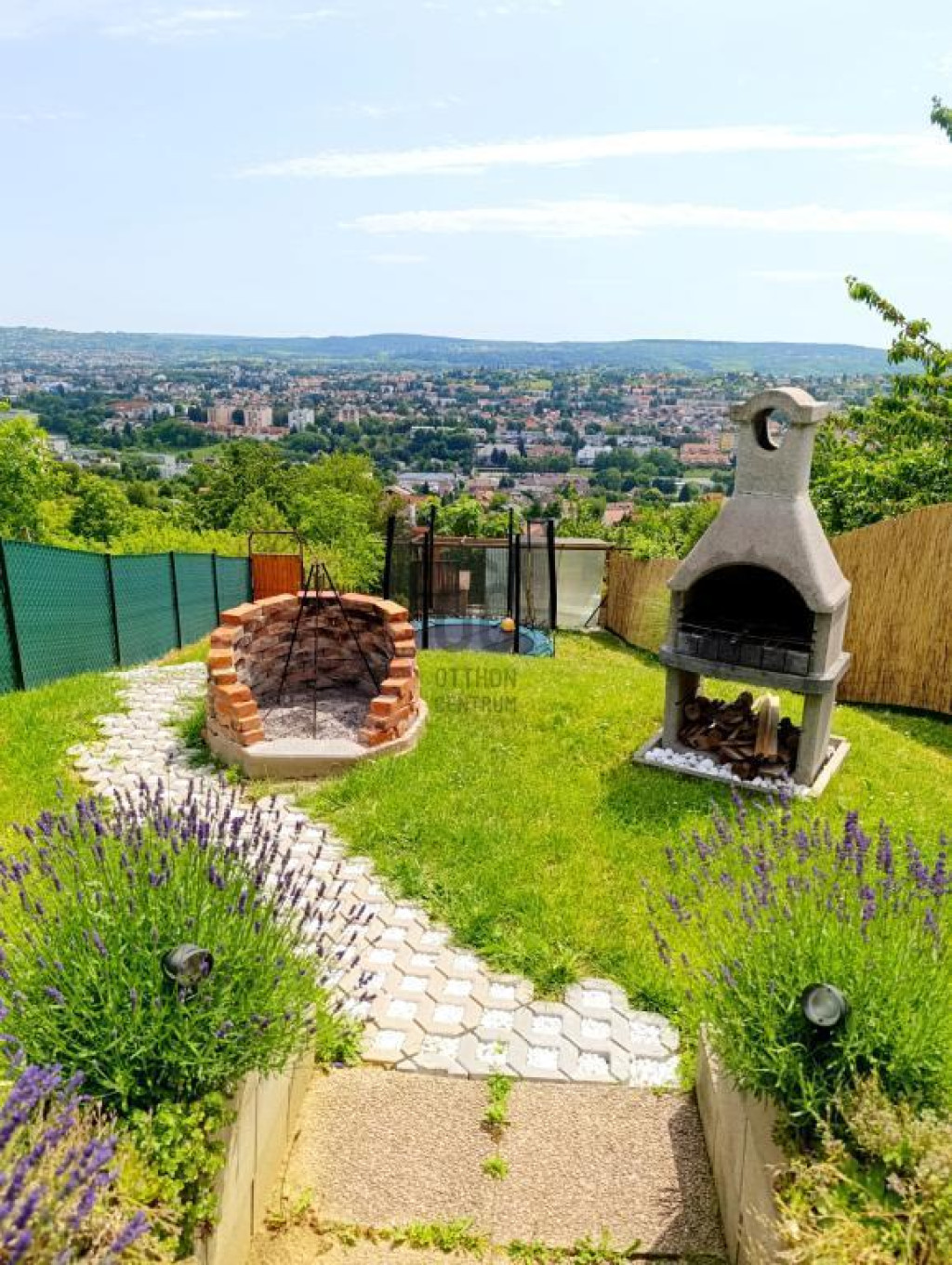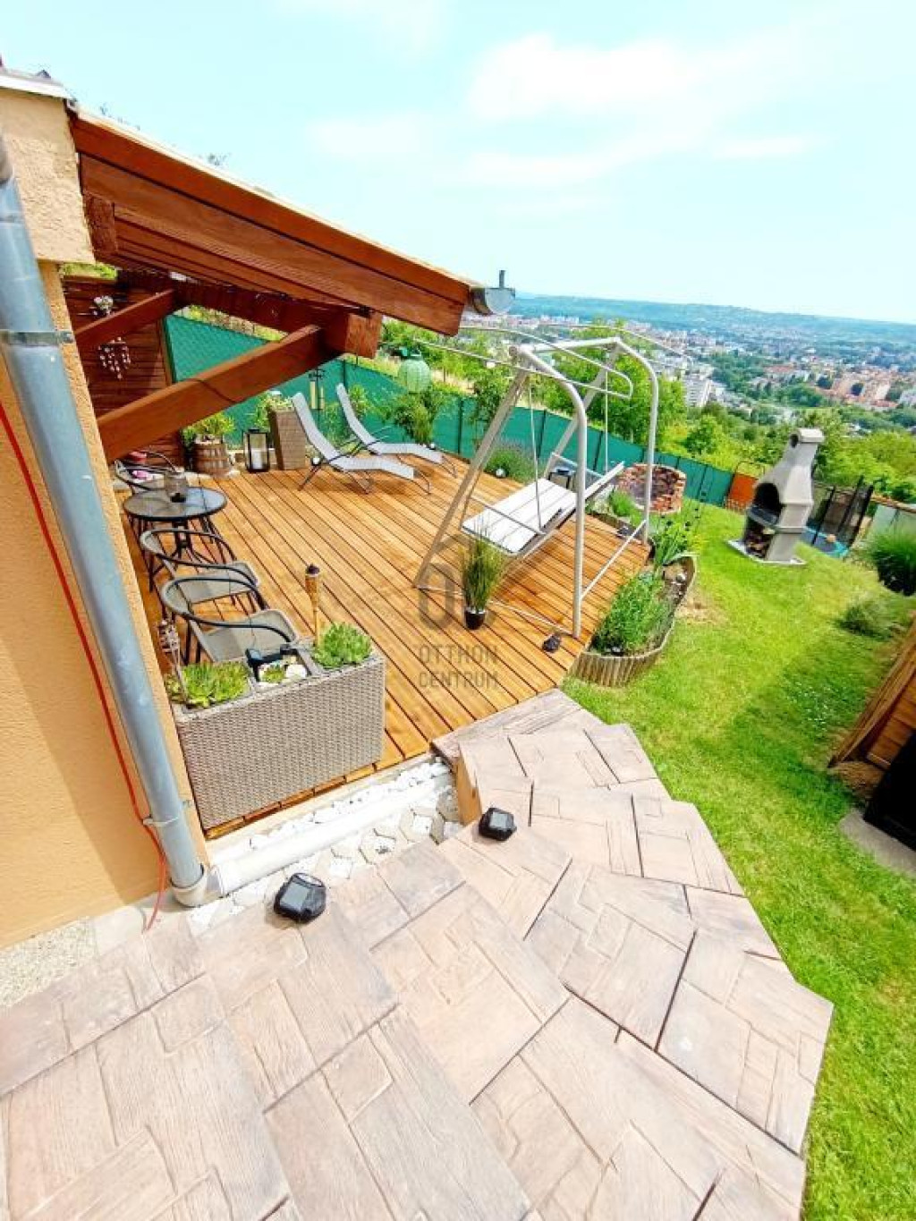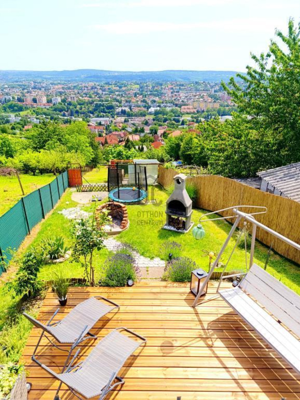 869 nm-es körbekerített, teraszos kialakítású telken fekszik, kerti sütővel, Jakuzzival, játszótérrel, trambulinnal, kerti kiegészítőkkel, tágas garázzsal és fedett gépkocsi beállóval melyek benne vannak az árban
