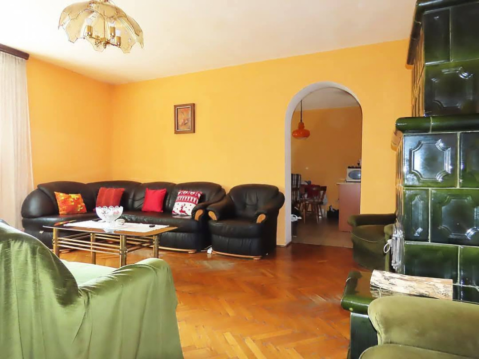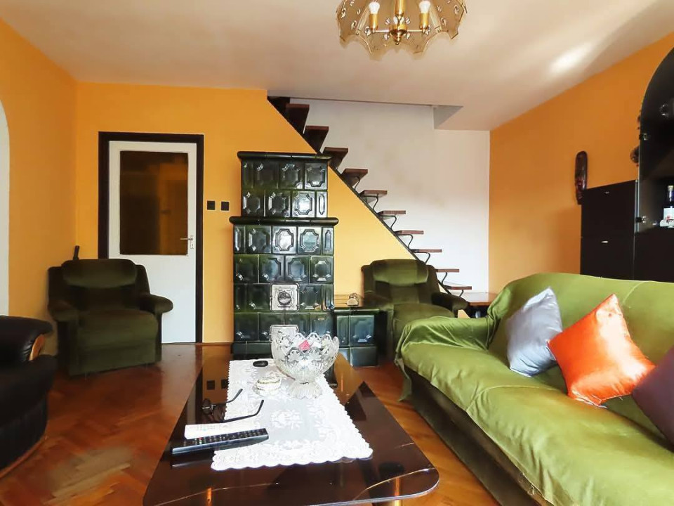 - nappali (parketta, cserépkályha, lépcső a felső szintre)