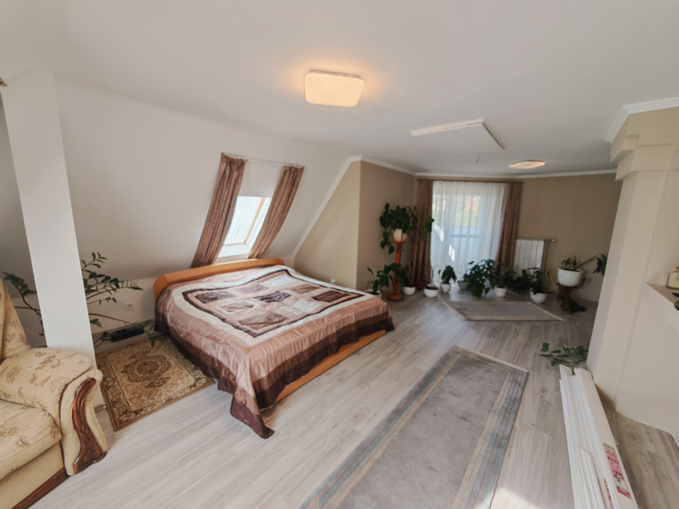 A felső szinten található 1 szoba+nappali+gardrobe,fürdőszoba külön wc-vel.