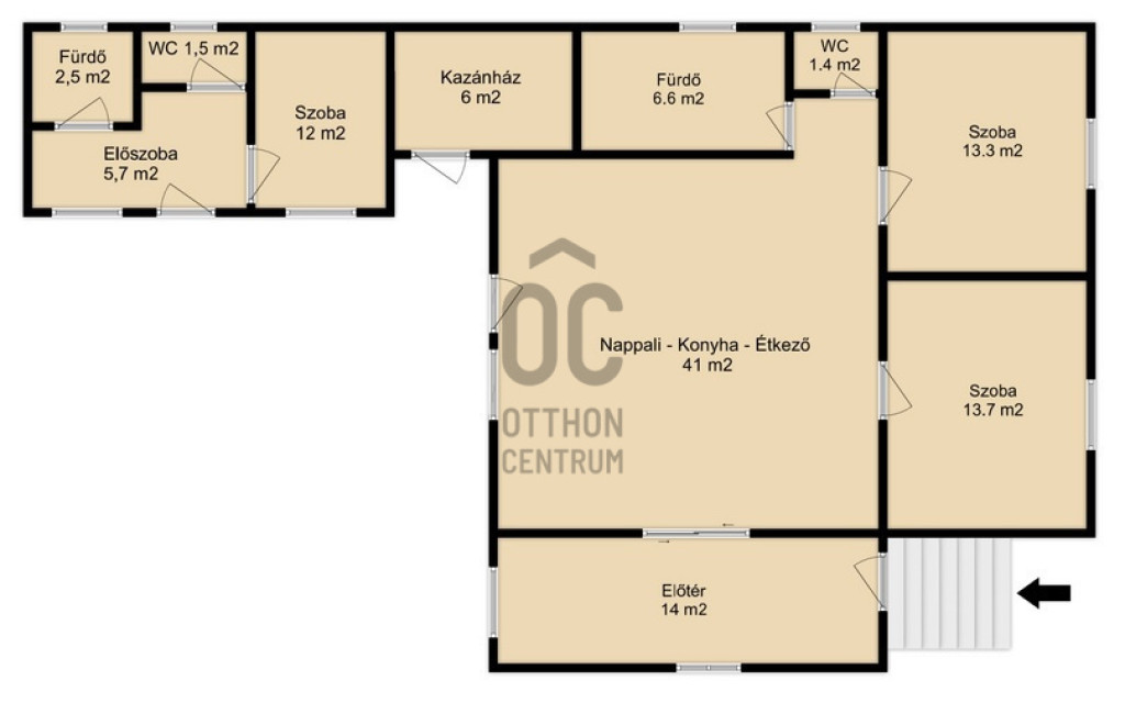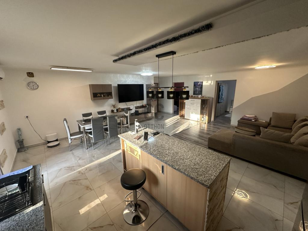 A burkolatok és a helyiségek elosztása a mai, modern igényeknek megfelelő, ezt az érzetet tovább fokozza az amerikai konyhás nappali.