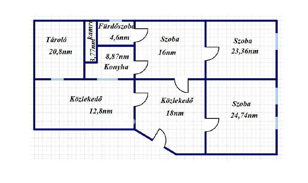 Az ingatlan 3 szobával, konyhával, fürdőszobával, két közlekedővel és kamrával rendelkezik.