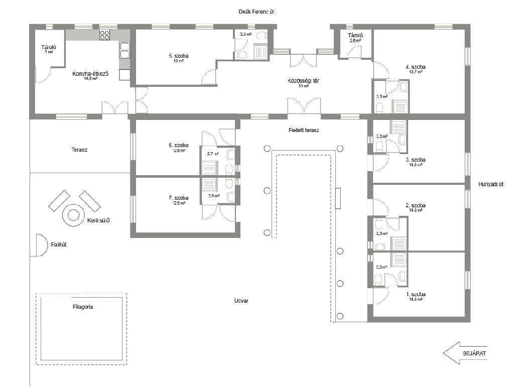 Tágas közösségi tér az épületen belül - tökéletes nagyobb társaságoknak, családoknak.