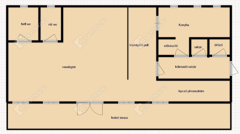 - helyiségek: vendég tér, kiszolgáló pult, női-férfi mosdó, közlekedő, konyha, előkészítő, mosogató, személyzeti öltöző-zuhanyzó, fedett terasz