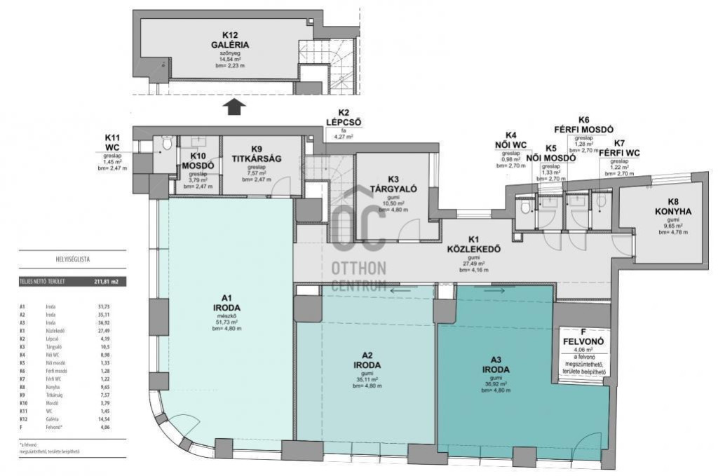 A saroképület földszintjén elhelyezkedő üzlethelyiség tulajdoni lap szerint 188 m², tényleges alapterülete azonban 212 m². Korábban irodai funkciót látott el, jelenleg üresen áll. Az ingatlan belső kialakítása rendkívül rugalmas: a társasház középső főfala teljes hosszban kiváltásra került, kizárólag tartópillérek maradtak meg. A jelenlegi tégla válaszfalak bontásával – szerkezeti beavatkozás nélkül – a teljes terület egybenyitható. Az üzlethelyiség összesen 7 utcai üvegportállal rendelkezik, sarokelhelyezkedésének köszönhetően pedig kiváló láthatóságot és figyelemfelkeltő megjelenést biztosít.