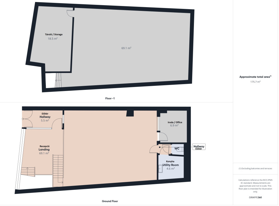 A felső szinten egy nagy helyiség, egy különálló iroda beépített bútorral, teakonyha és mosdó található. Az alsó szinten, ami egy nagy helyiségből áll található még egy tárolóhelyiség is.