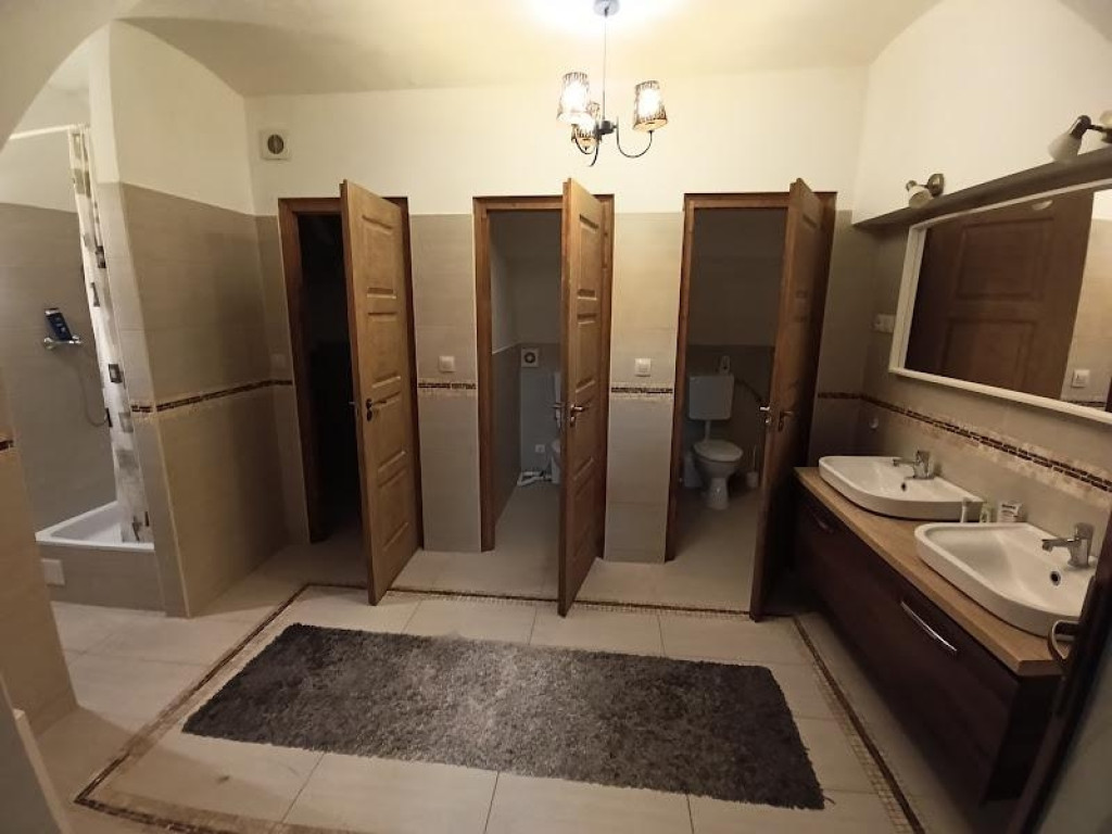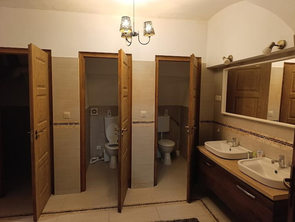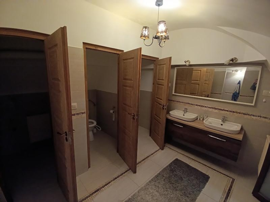 Mosdóhelyiség két külön bejáratú WC-vel és két zuhanyzóval