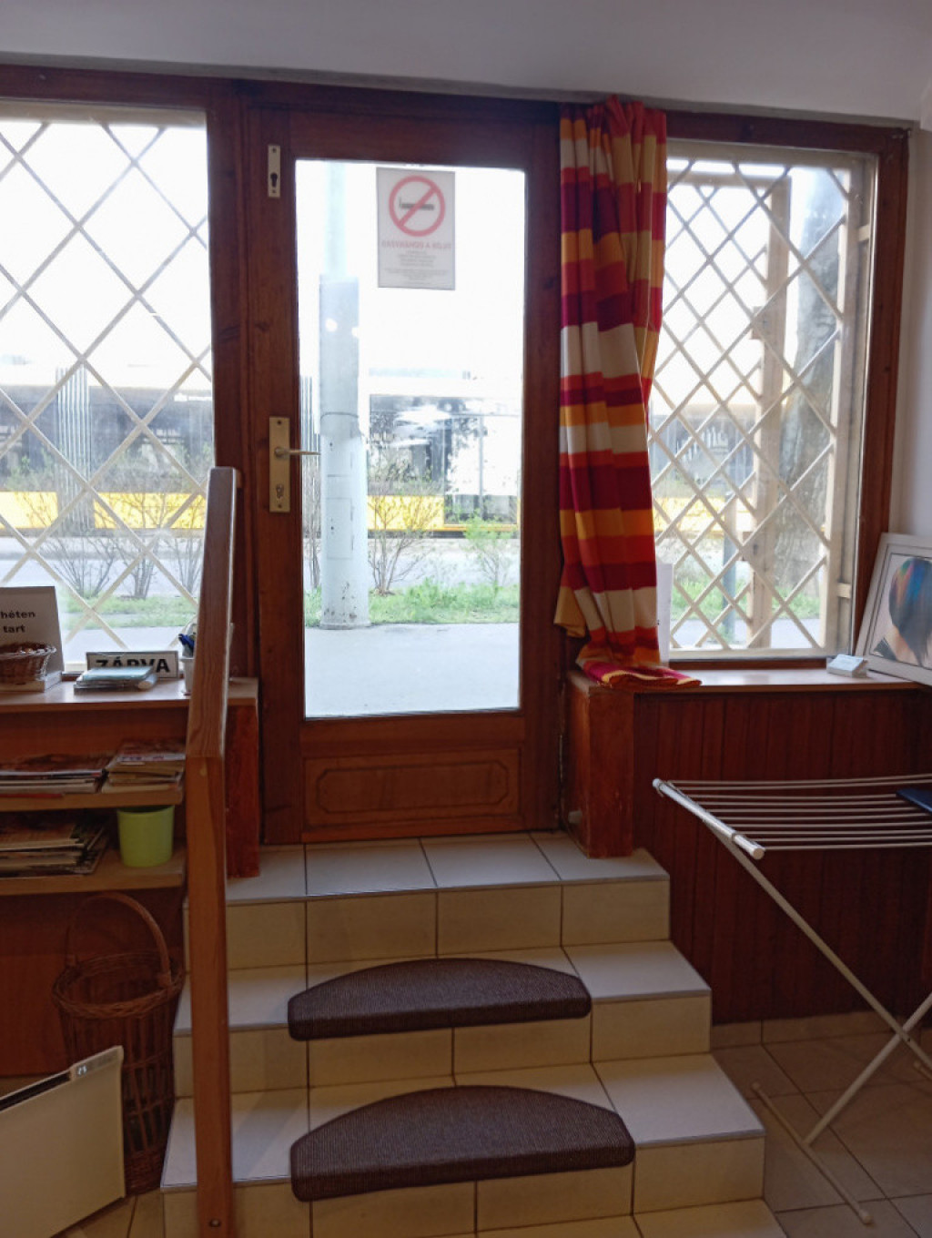 Maga a helység négy lépcsőnyire marad el a járda szintjétől, de teljesen világos, két nagy ablak és bejárati ajtó adja a fényt és egyben zárja ki a hideget, lévén termo üveg és rajta fólia.