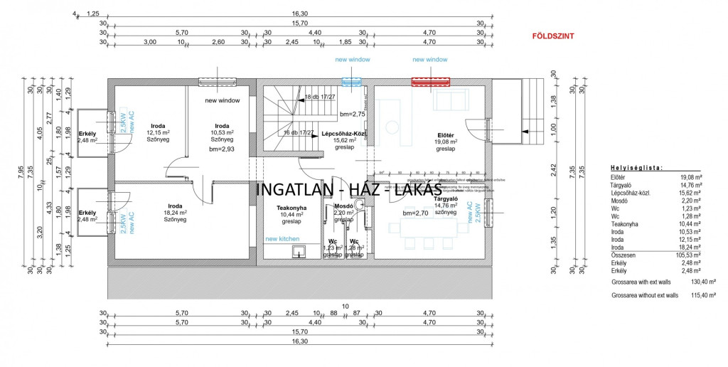 Fszt: 130m2 (3 db iroda, tárgyaló, előtér, teakonyha, mosdó, zuhanyzó, erkély)