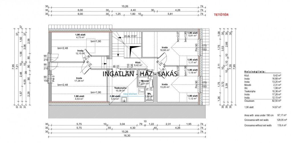 Tető tér: 130m2 (4 db iroda, teakonyha, mosdó)